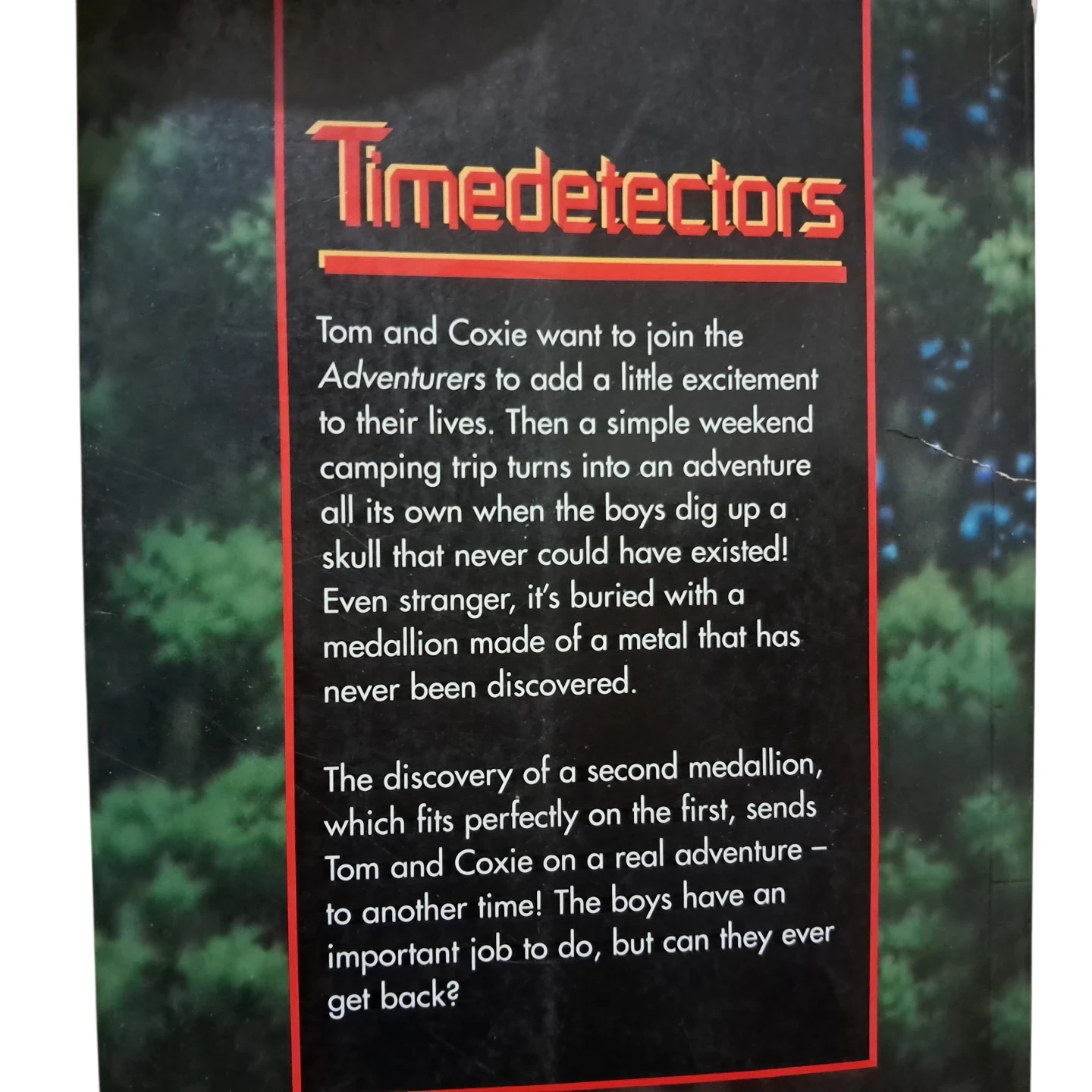 This book is written by Darrel and Sally Odgers and illustrated by Richard Hoit. It's about Tom and Coxie who want to join the Adventurers for excitement. Their camping trip turns into an adventure when they dig up a skull with a mysterious medallion. This leads them on a time-traveling adventure!
