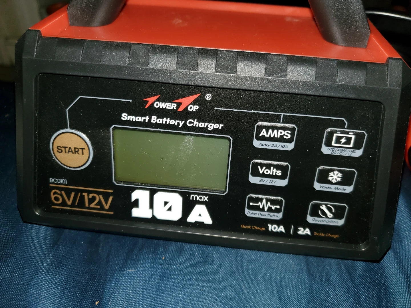 This is a POWER TOP 10A smart battery charger. It supports 6V and 12V batteries. It features independent pulse desulfation, a 5-stage charging program, battery recondition, and winter mode. Quick charge is 10A, with a 2A trickle charge option.