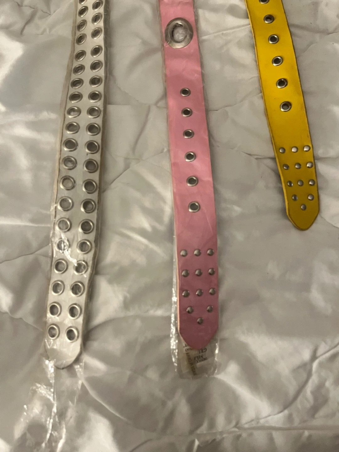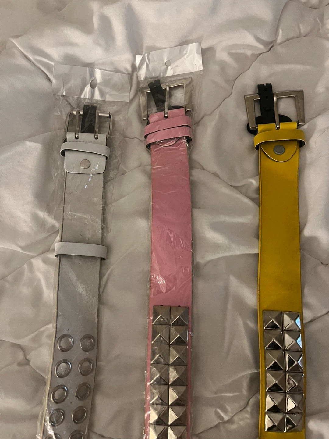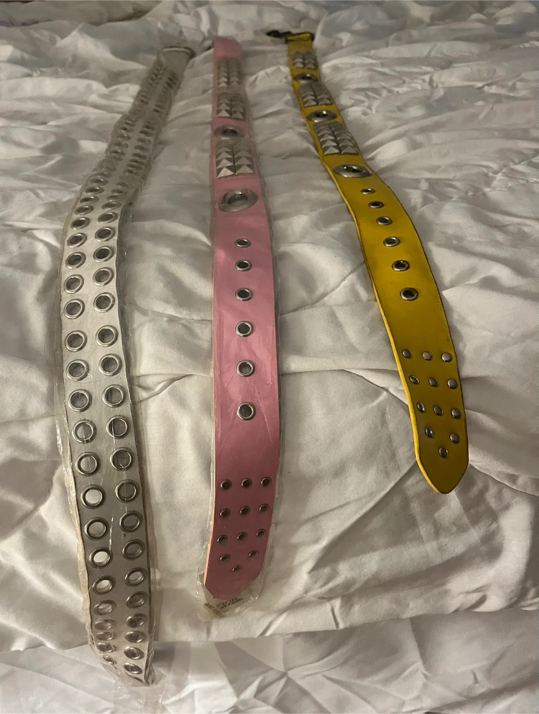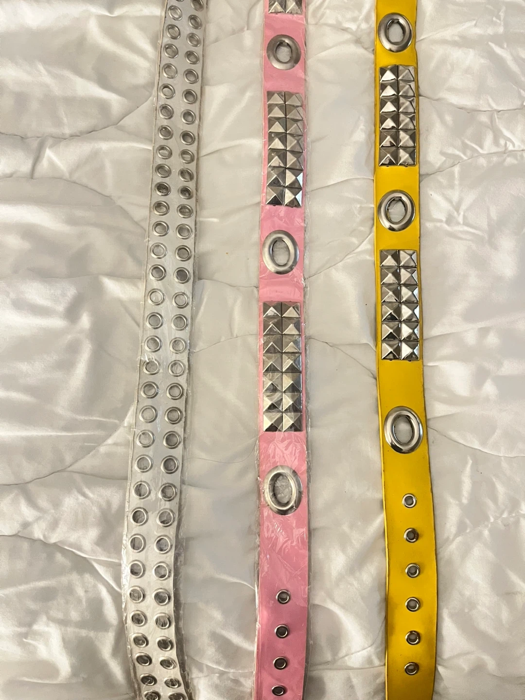 Three studded belts in white, pink, and yellow. Each belt features grommets and metal stud detailing. They're perfect for adding a bit of flair to any outfit!