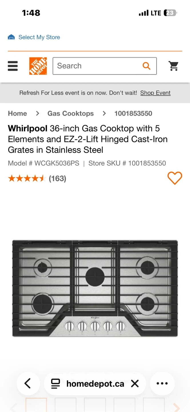 Whirlpool 36-inch gas cooktop with 5 elements. Features EZ-2-Lift hinged cast-iron grates in stainless steel. It has dishwasher-safe grates and a wall oven compatible design.
