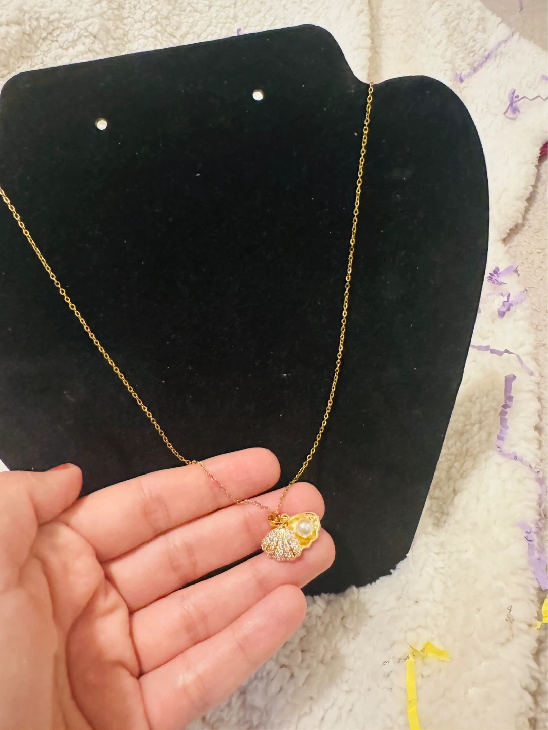 A delicate gold-tone necklace featuring a shell pendant adorned with cubic zirconia and a small pearl. The chain is dainty and adjustable. It's a lovely piece that adds a touch of elegance.