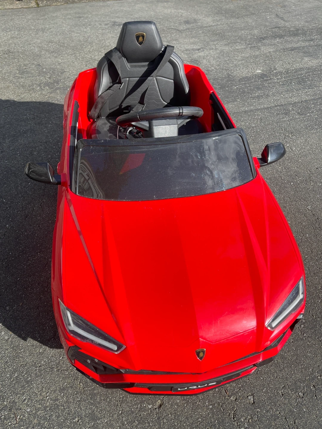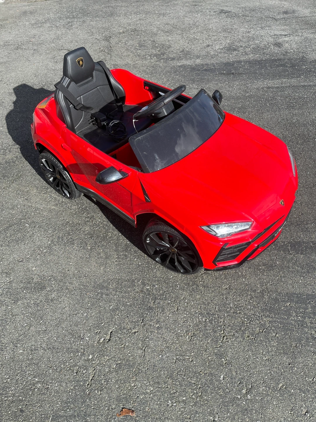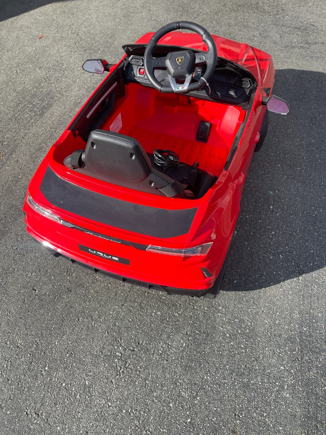This is a red kids' ride-on electric car, modelled after the Lamborghini Urus. It features a realistic steering wheel and a seat with a safety belt. A remote control is included for parental supervision. This car is powered by electricity for fun outdoor play!