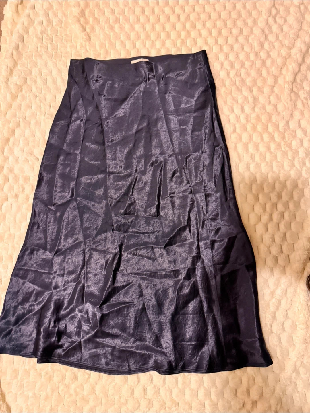 This is a navy blue midi skirt from BABATON. It's made of a satin-like material with a slight sheen. The skirt has a relaxed fit and is perfect for dressing up or down.