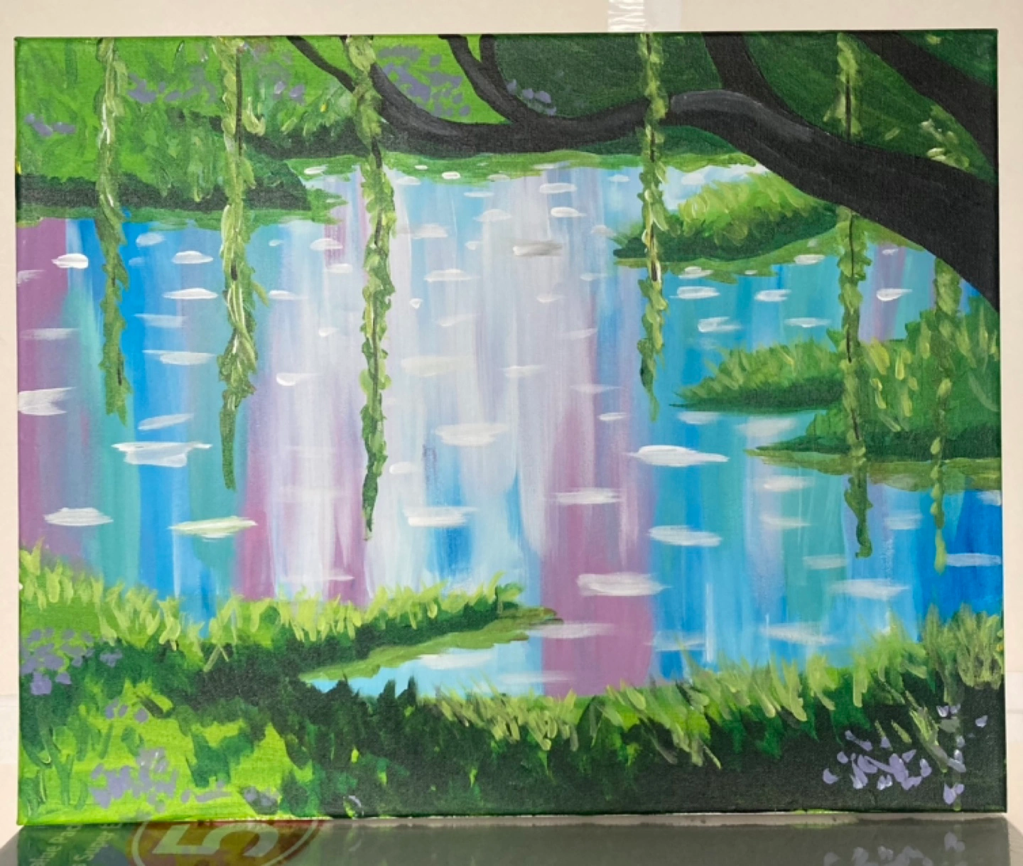 Acrylic painting on canvas depicting a pond and Willow landscape. Features lush green foliage, purple and blue water with white clouds, and hanging willow branches. It's a colourful piece for your home decor.