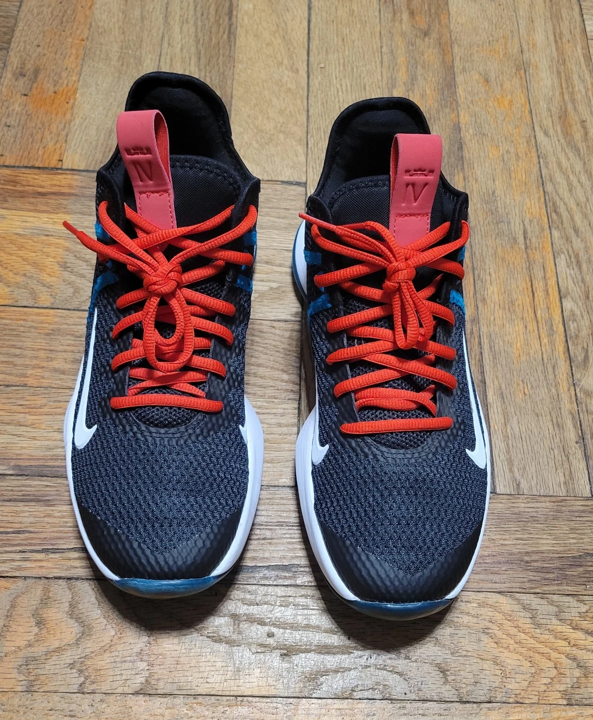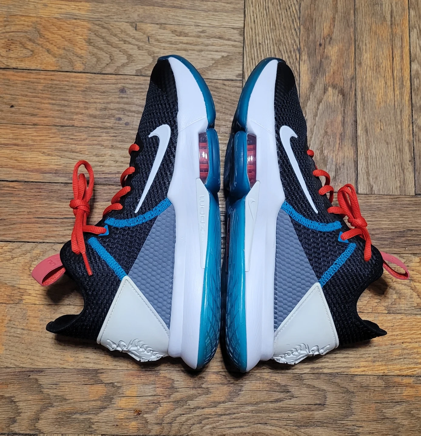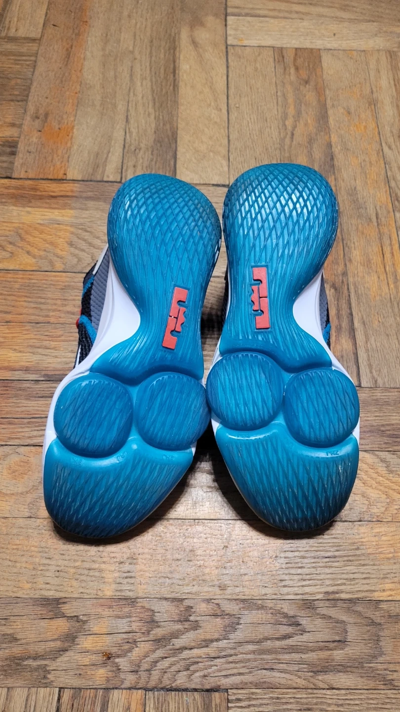Nike LeBron Witness 5 basketball shoes. US Size 7. Black with red and blue accents. Features a lion emblem on the heel.