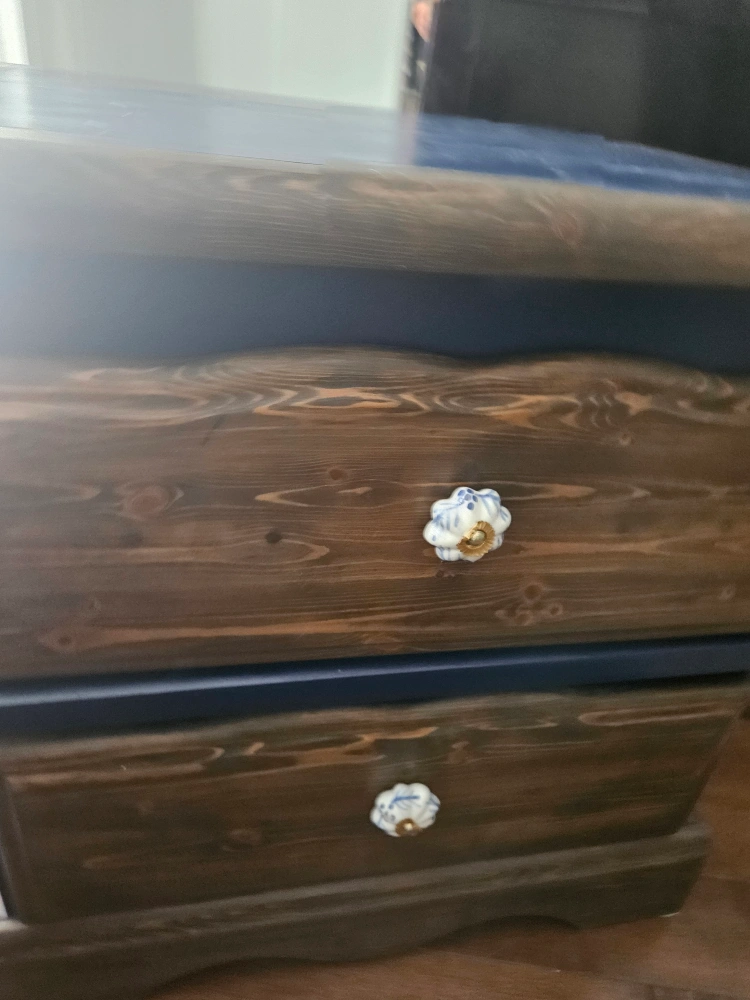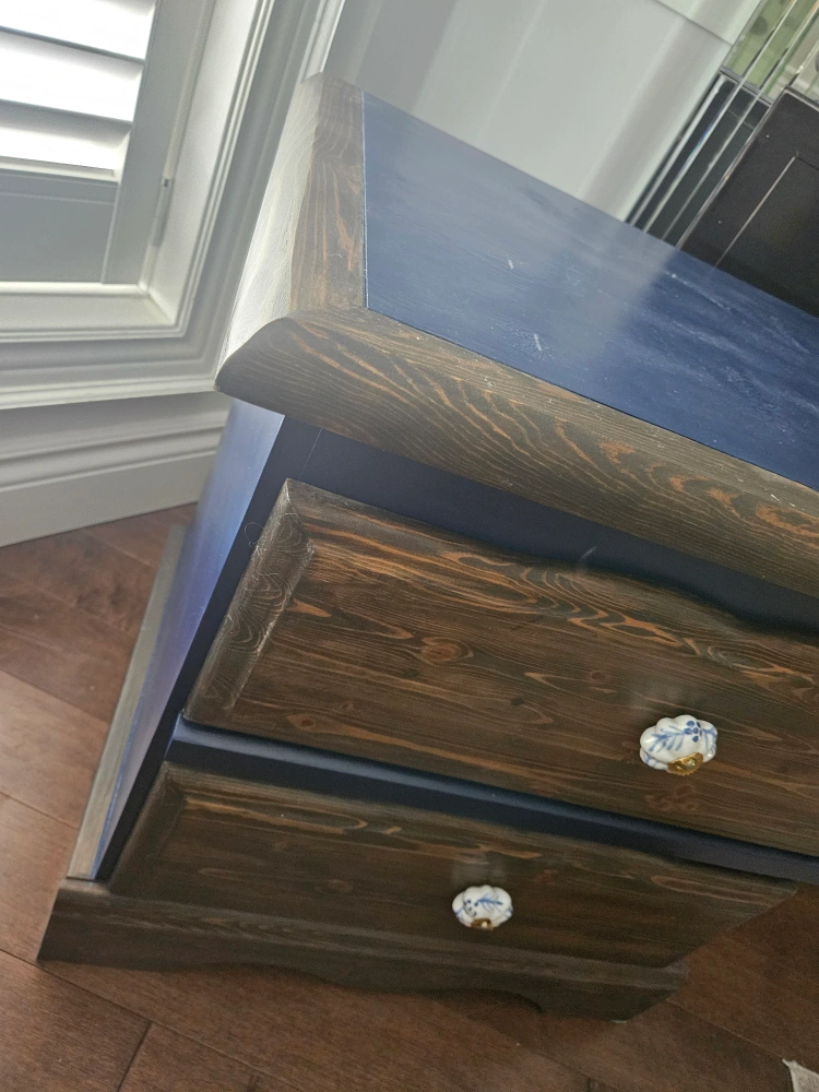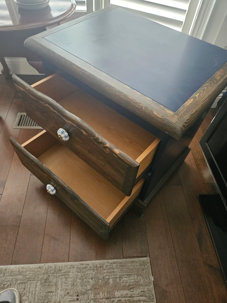 Nightstand with two drawers. Drawers open and close. Wooden frame with blue accents. It would be perfect to hold a book and your favourite mug.