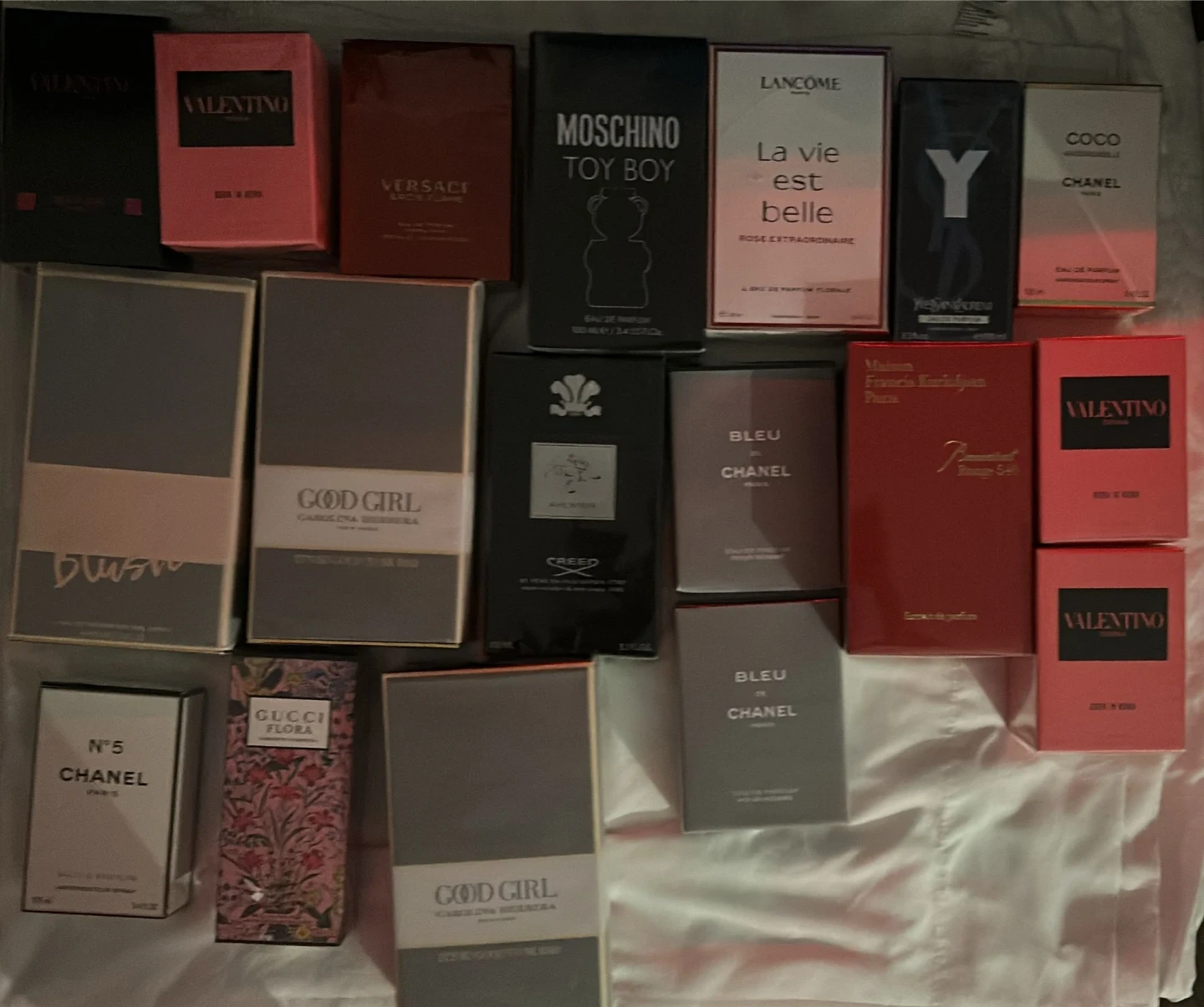 Collection of popular fragrances. Includes Valentino Donna Born In Roma, Chanel N°5 Eau de Parfum, Versace Eros, and Moschino Toy Boy. Also features Carolina Herrera Good Girl, Lancome La Vie Est Belle, Creed Aventus, and Yves Saint Laurent Y Eau de Parfum. Assorted sizes and scents available.