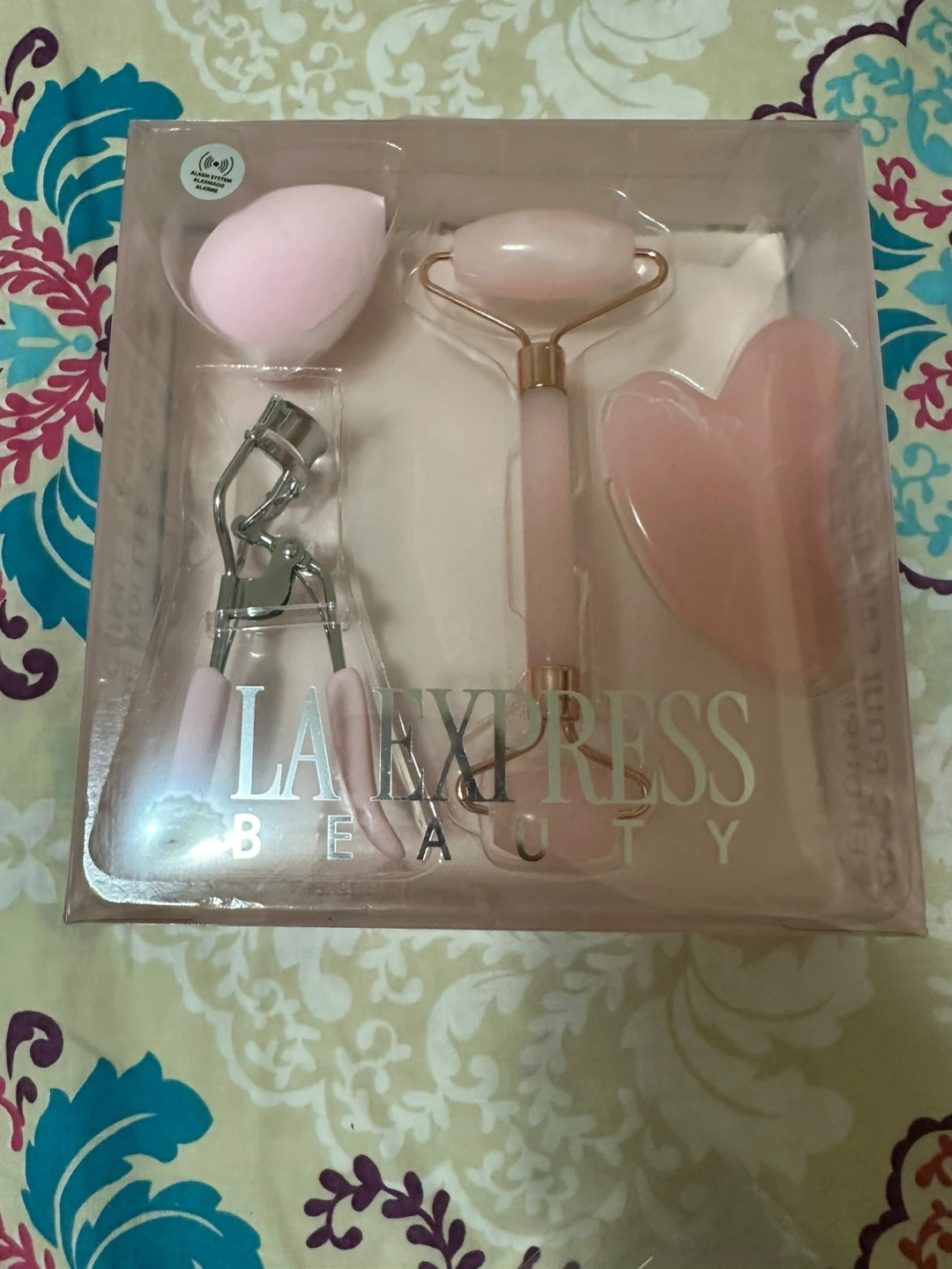 This La Express Beauty set includes a rose quartz facial roller, a gua sha tool, an eyelash curler, and a makeup sponge. Tools are made from rose quartz and metal. Get a spa-like facial treatment at home!