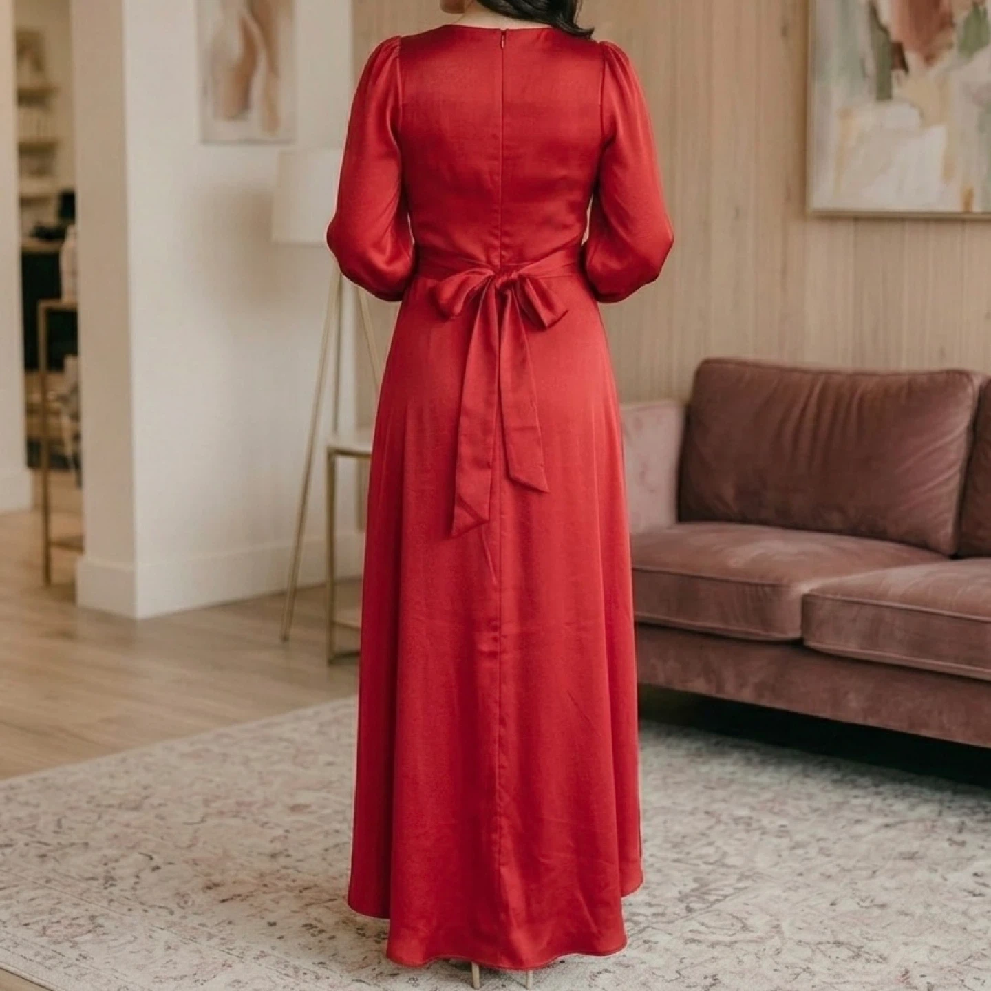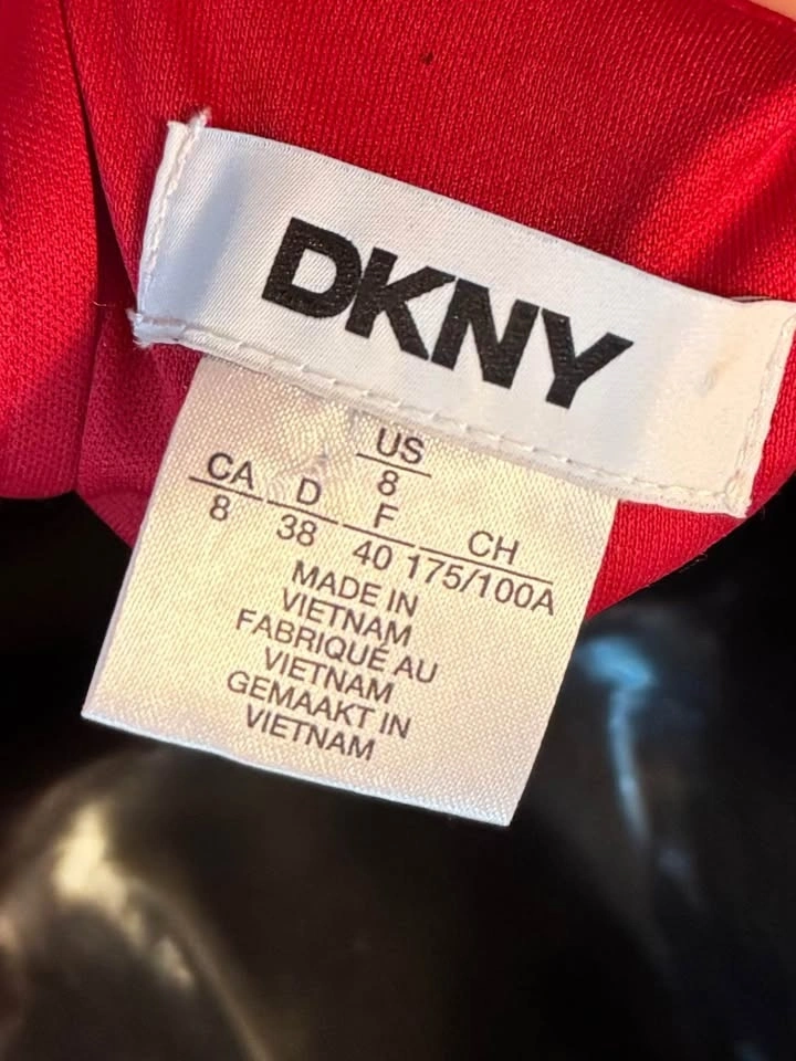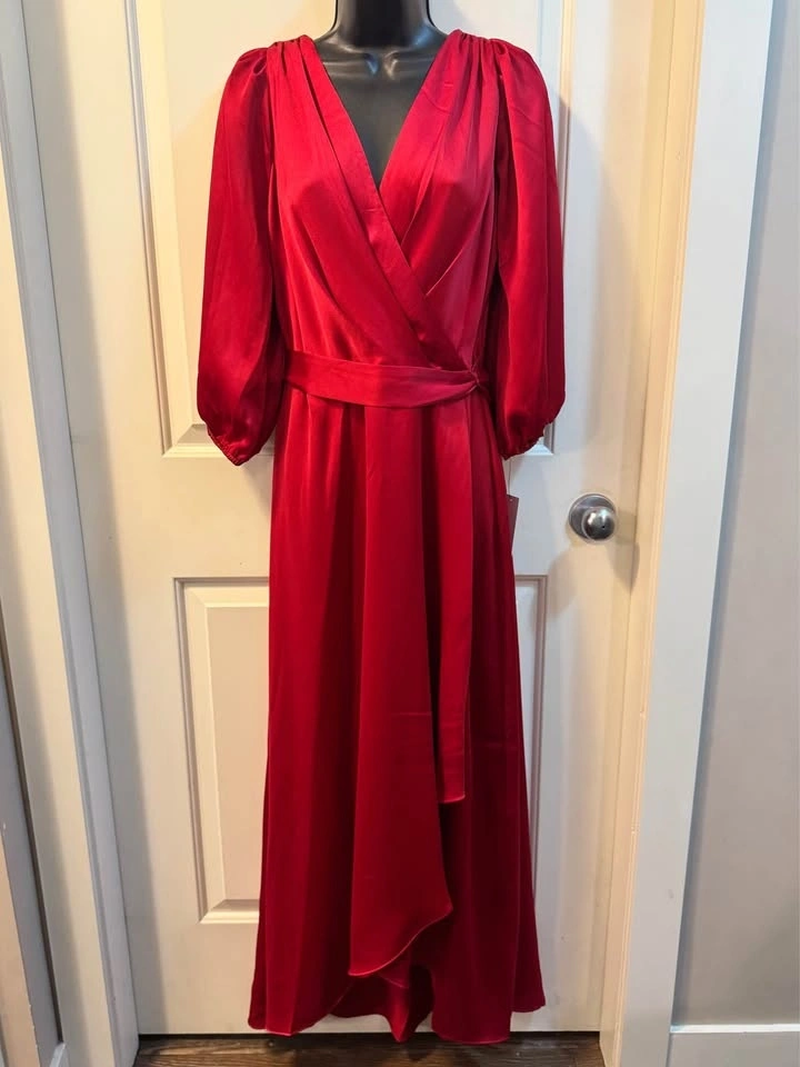 Brand new with tags DKNY satin maxi dress in a stunning scarlet red. This elegant wrap-style gown features a flattering V-neckline, softly gathered shoulders, long blouson sleeves, and a self-tie waist that cinches beautifully for a feminine silhouette. The flowing full-length skirt drapes effortlessly, making it perfect for formal events, weddings, holiday parties, or special evenings out.