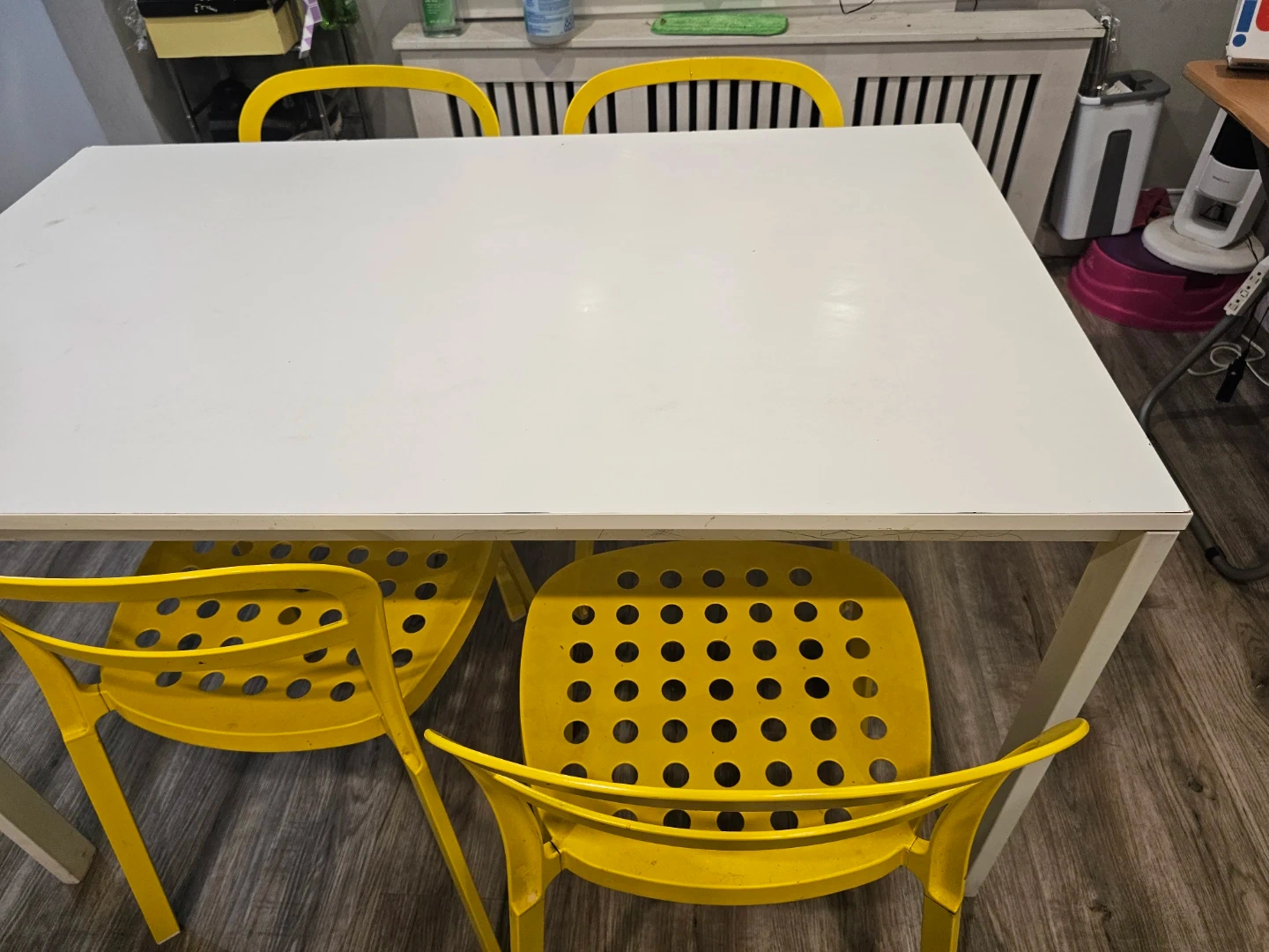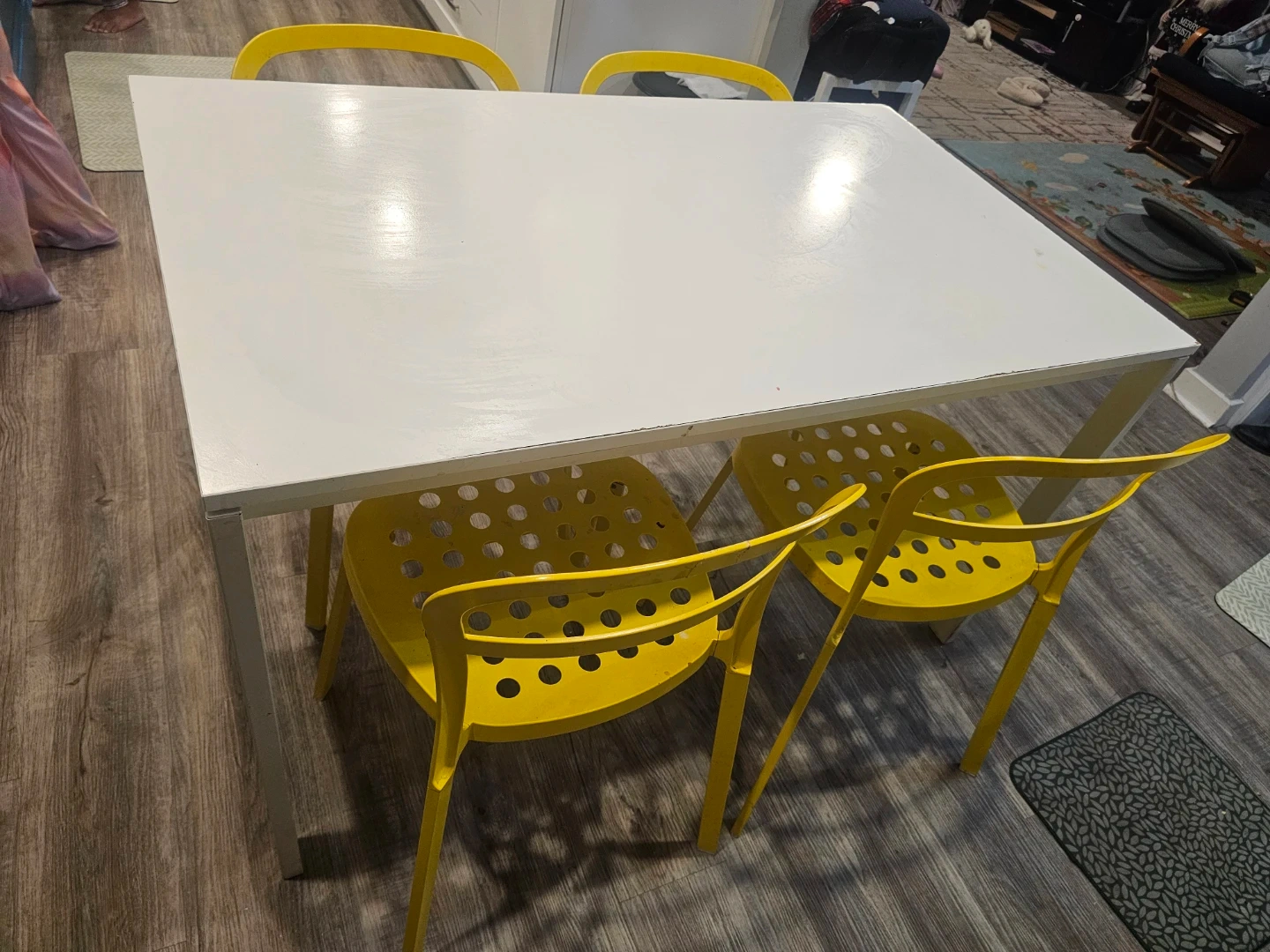 White laminate dining table with four bright yellow chairs. Perfect for a breakfast nook or small dining area. Chairs stackable for easy storage.