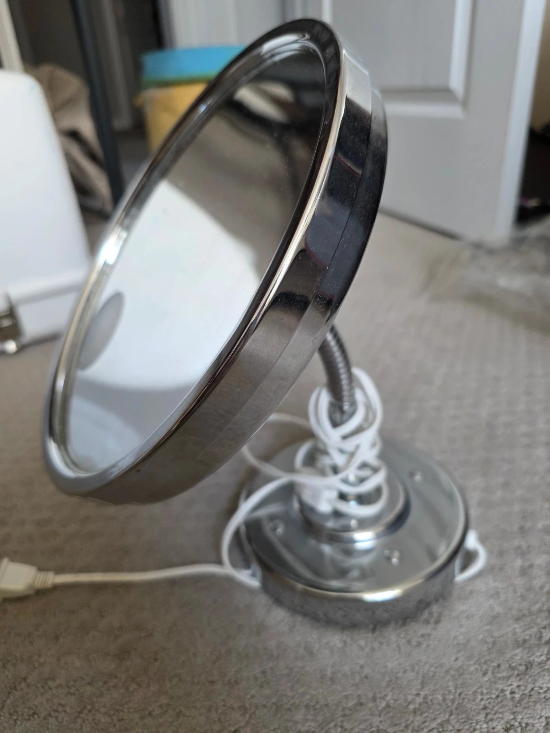 This is a silver vanity mirror with a flexible neck and a circular base. It's powered by a cord with a standard plug. The mirror is double-sided and swivels for easy adjustment. It's great for applying makeup or any detailed grooming task.