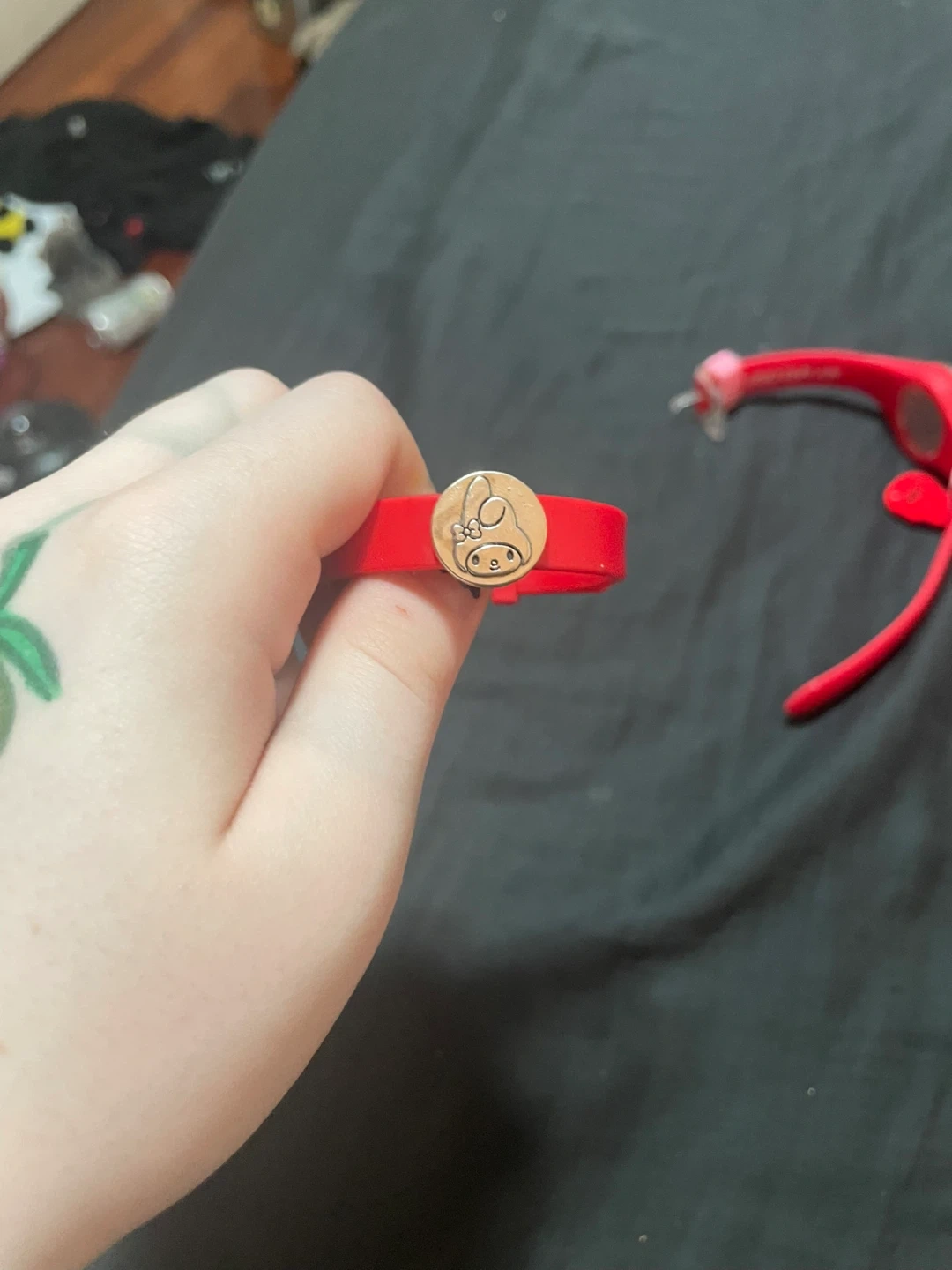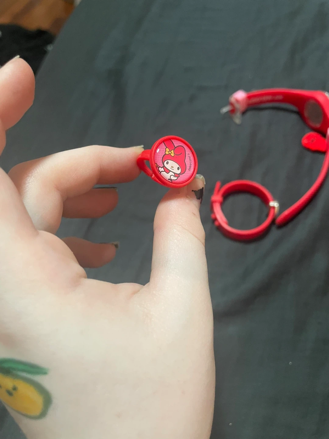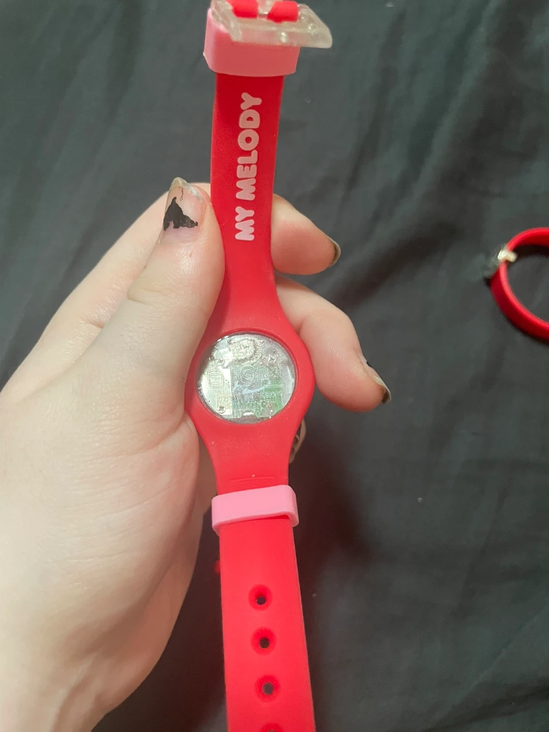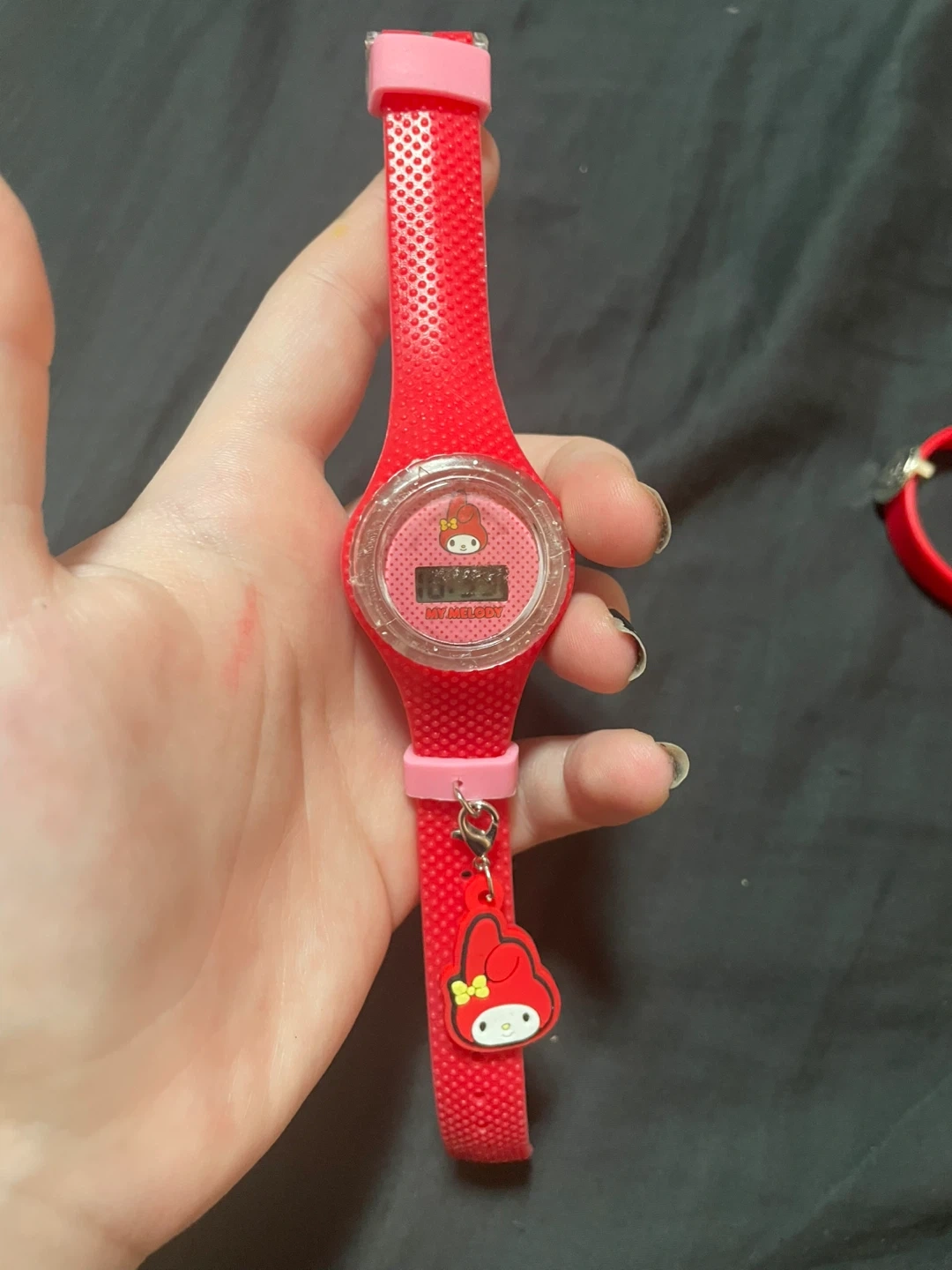 This is a cute My Melody digital watch in bright red. It features a My Melody character design on the face. The strap is adjustable and includes a little My Melody charm. It's perfect for any fan of the character! It comes with a send band and a ring as well!