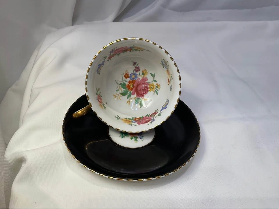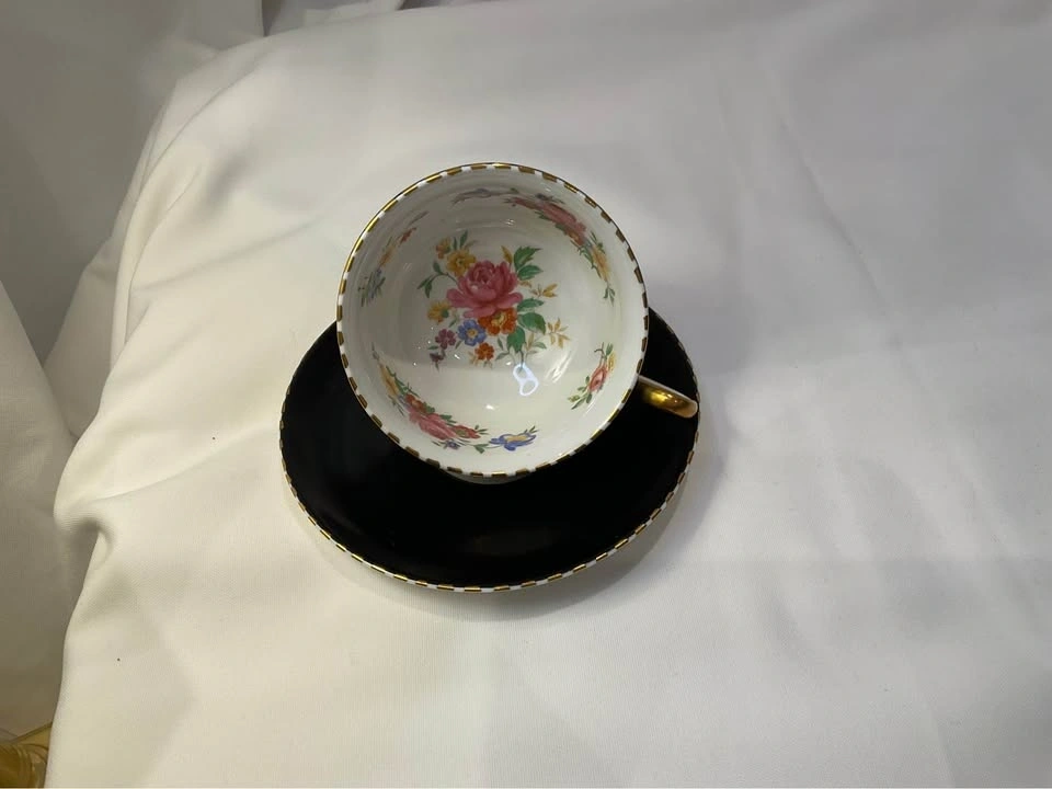 Royal Chelsea Vintage Tea Cup Cabbage Rose Black Teacup & Saucer