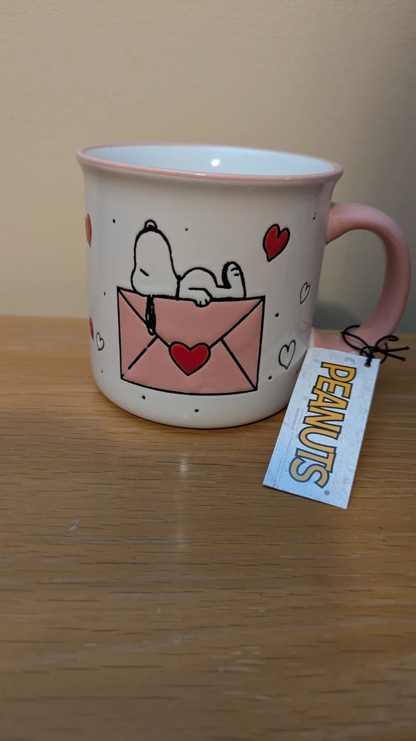 This charming Peanuts mug features Snoopy on an envelope with hearts and the "be my Valentine" message. It has a pink handle and trim. Ceramic construction.