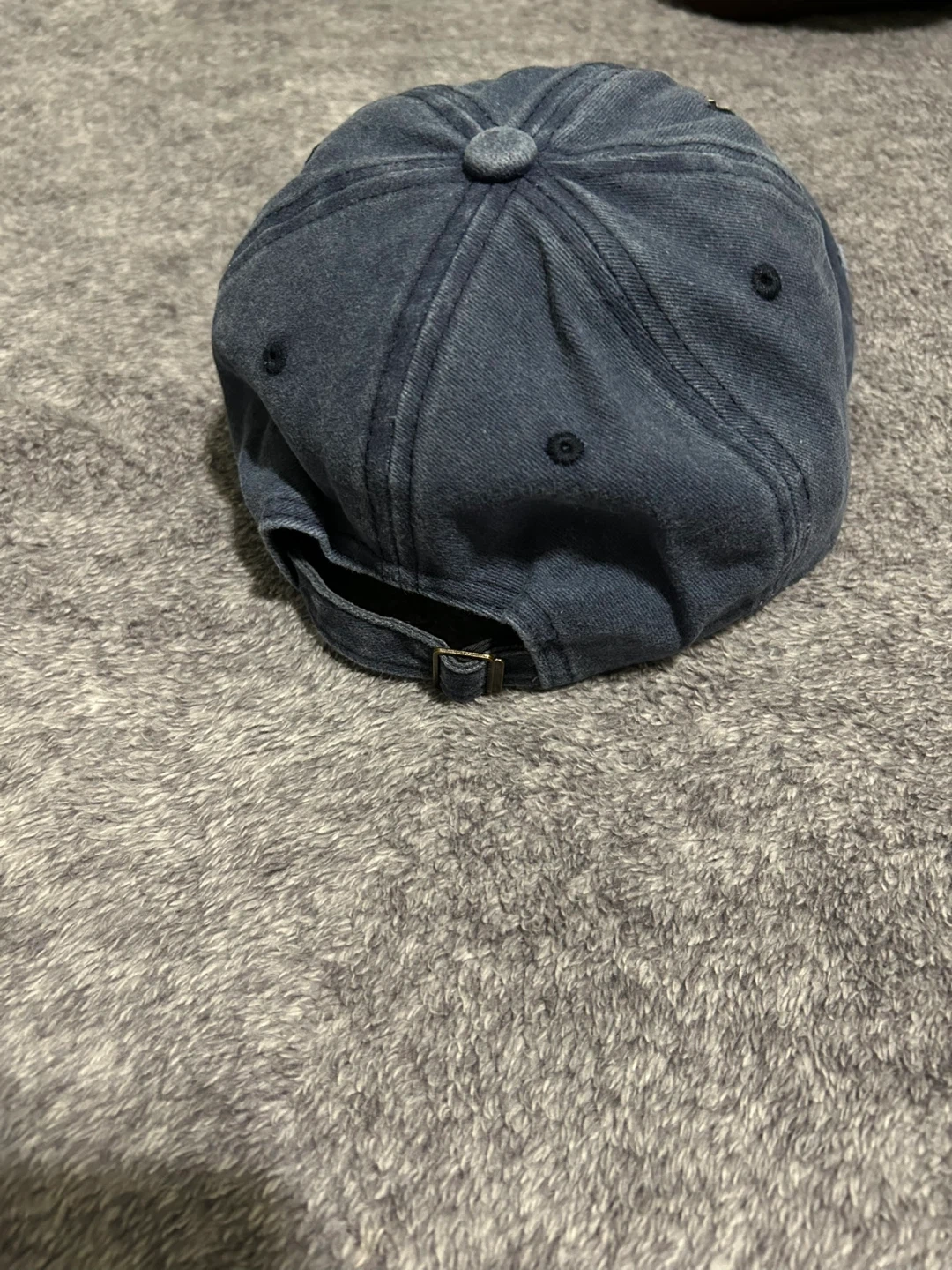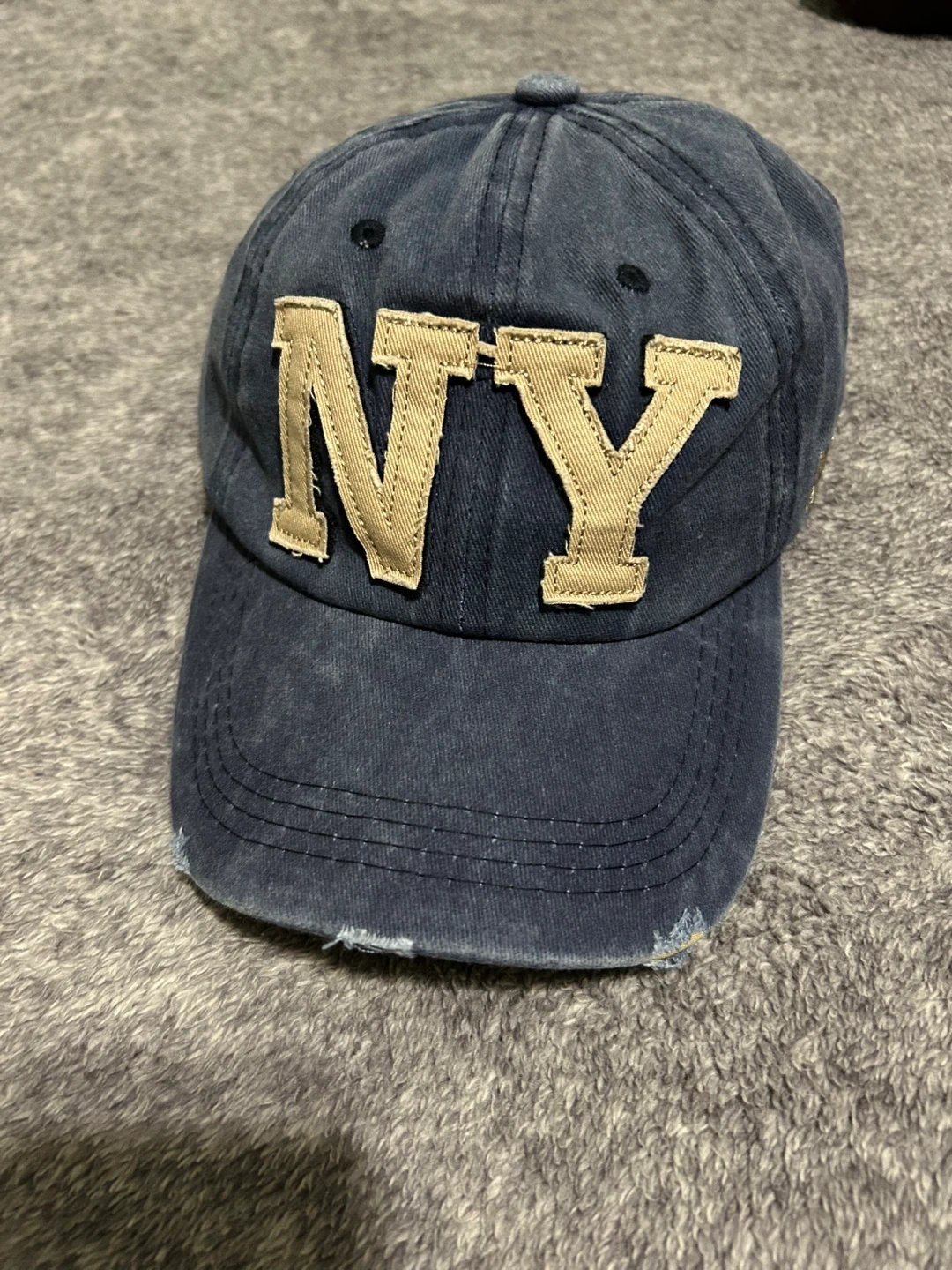 This distressed blue baseball cap features prominent "NY" embroidery on the front and "Air Force New York" on the side. It has an adjustable metal buckle strap for a comfortable fit. A classic casual accessory!