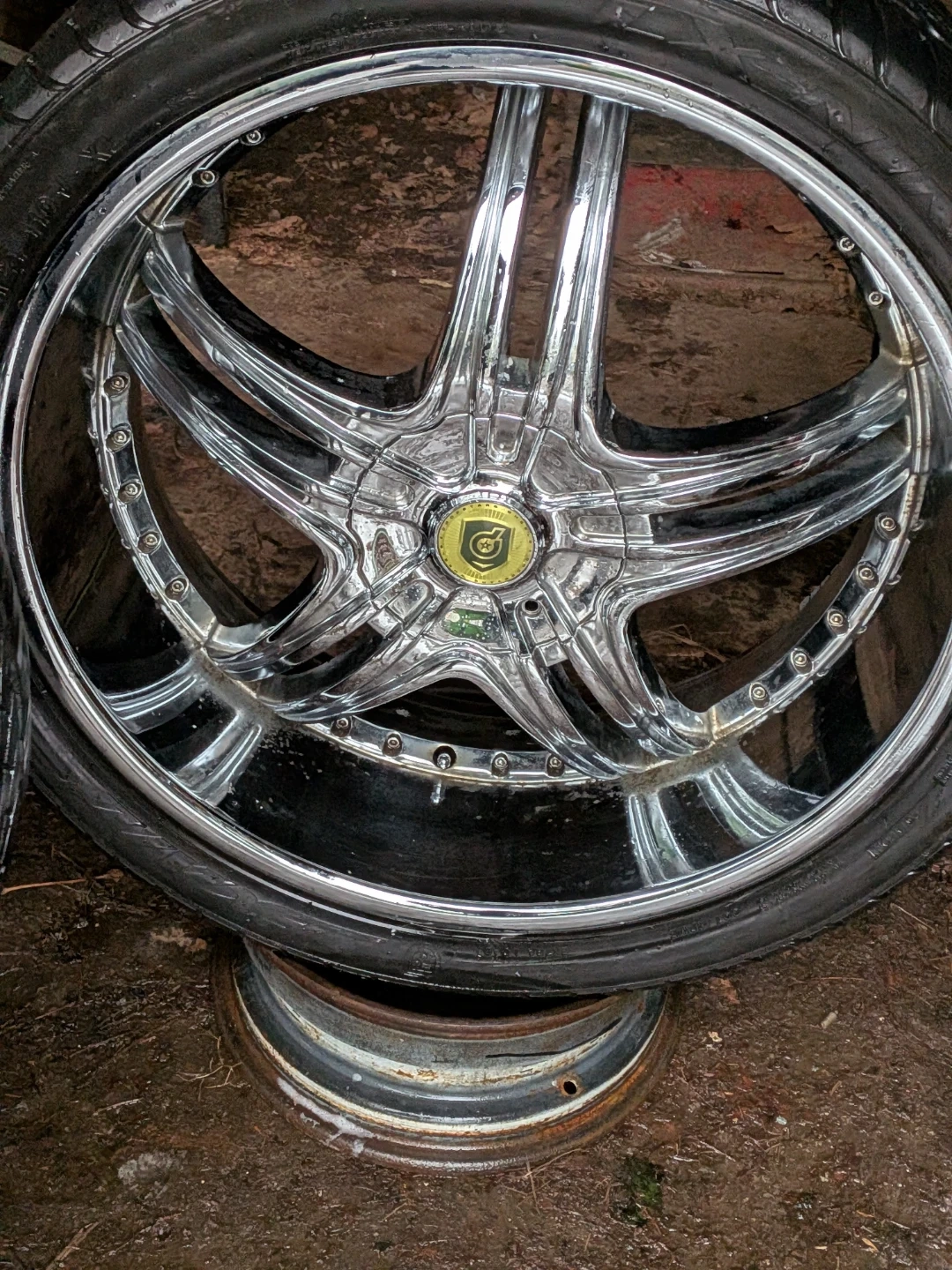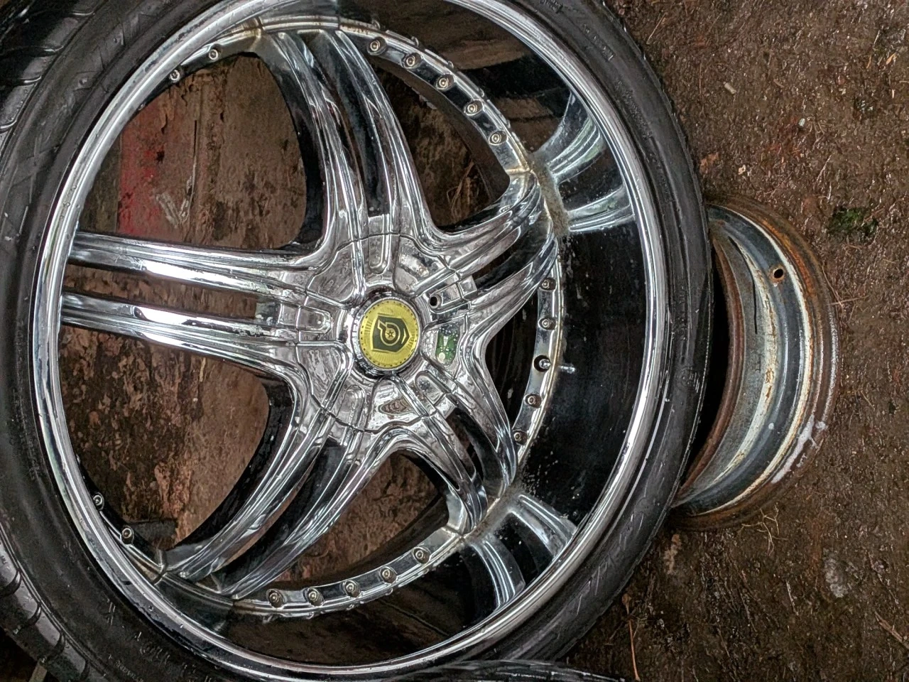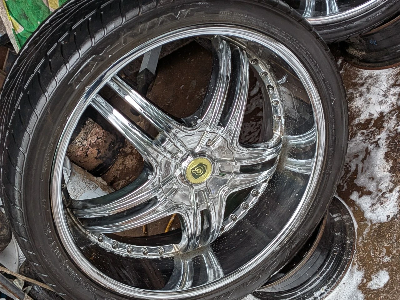 Set of four chrome rims with tires included. These wheels have a distinctive five-spoke design with a yellow and green centre cap. They're sure to give your vehicle a sharp look! Ready for installation.