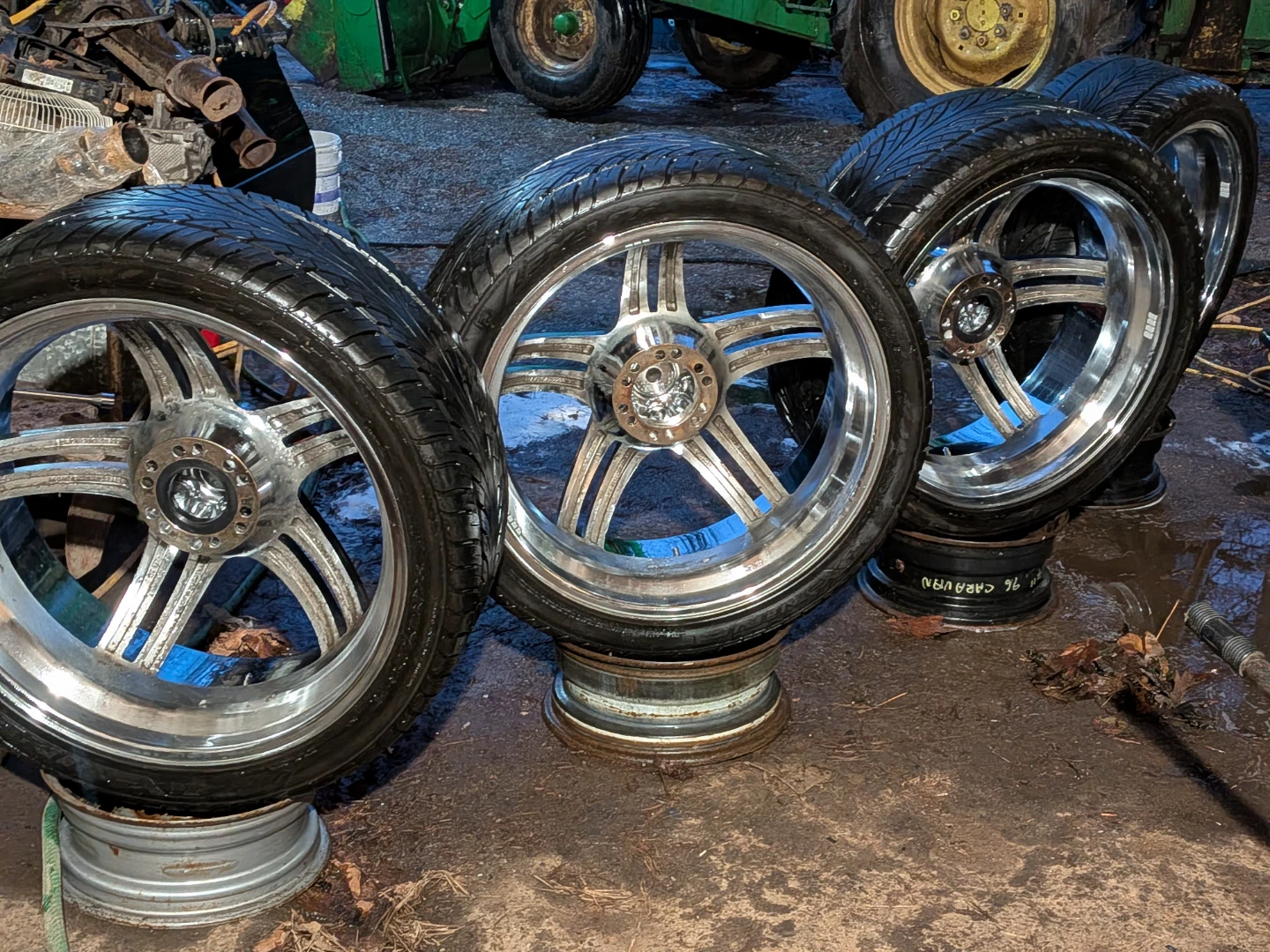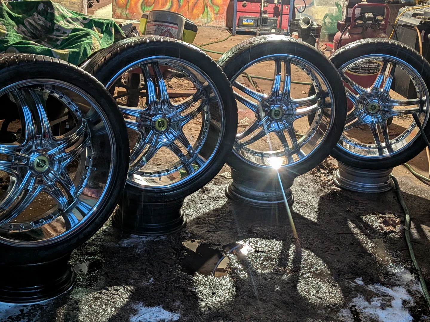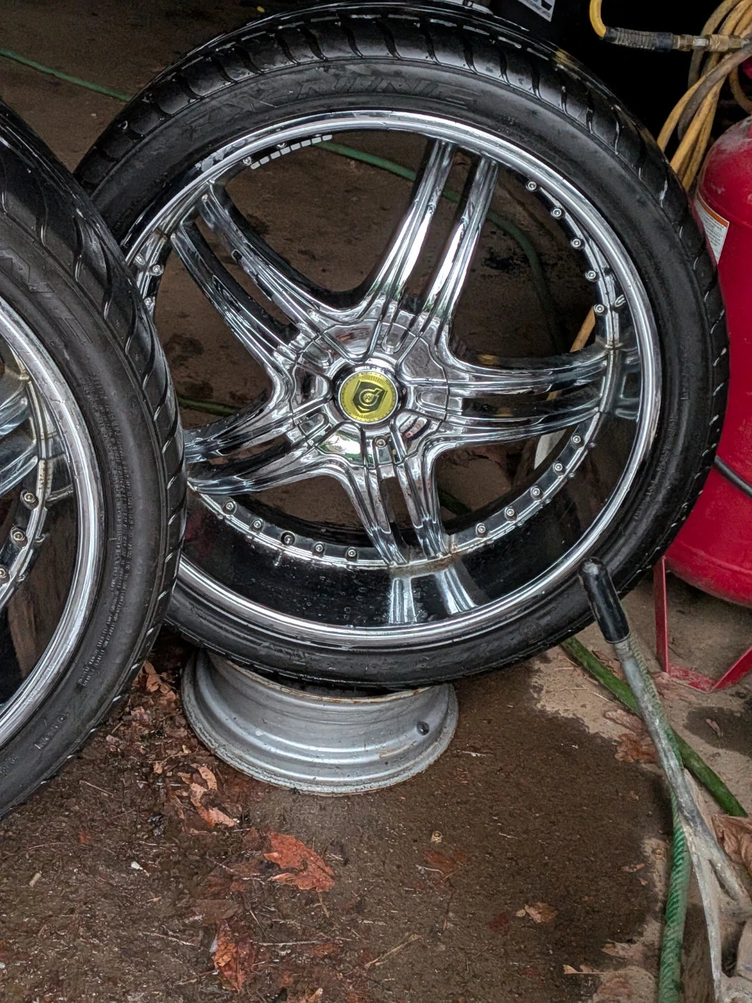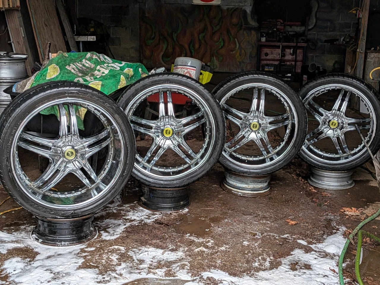 Set of four chrome rims with tires included. These wheels have a distinctive five-spoke design with a yellow and green centre cap. They're sure to give your vehicle a sharp look! Ready for installation.