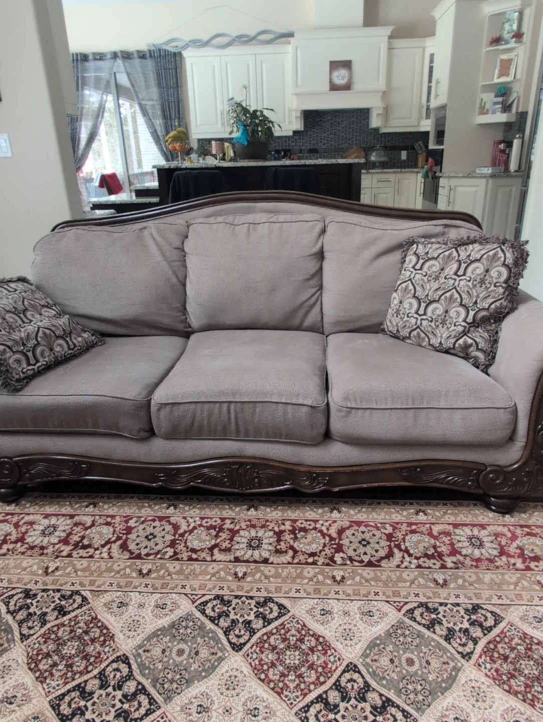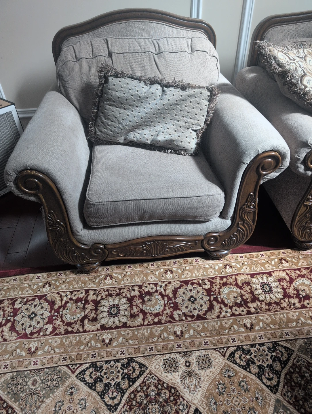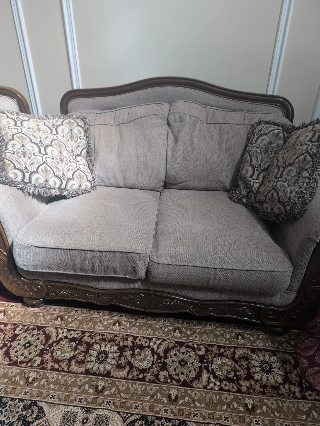 Ashley's Elegant living room furniture set featuring a sofa, loveseat, and armchair. Upholstered in a neutral fabric with ornate dark wood trim. Comes with decorative accent pillows. This set adds a timeless touch to any home!