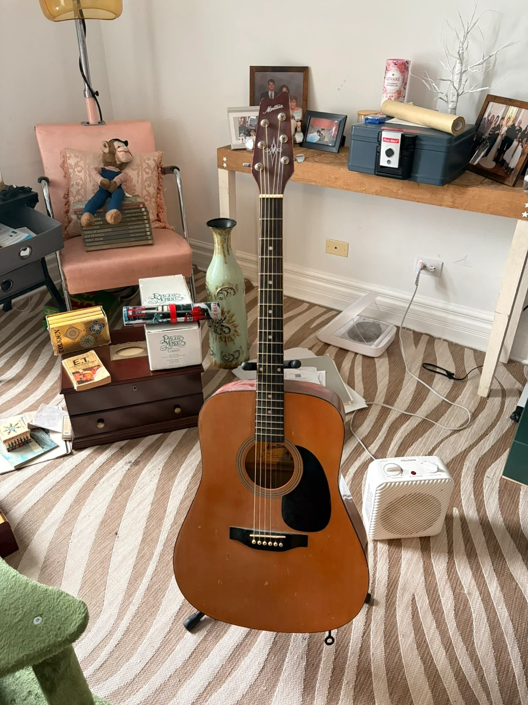 Acoustic guitar with a classic dreadnought body style. Features a natural wood finish with a black pickguard. Perfect for beginners or intermediate players looking for a reliable instrument.