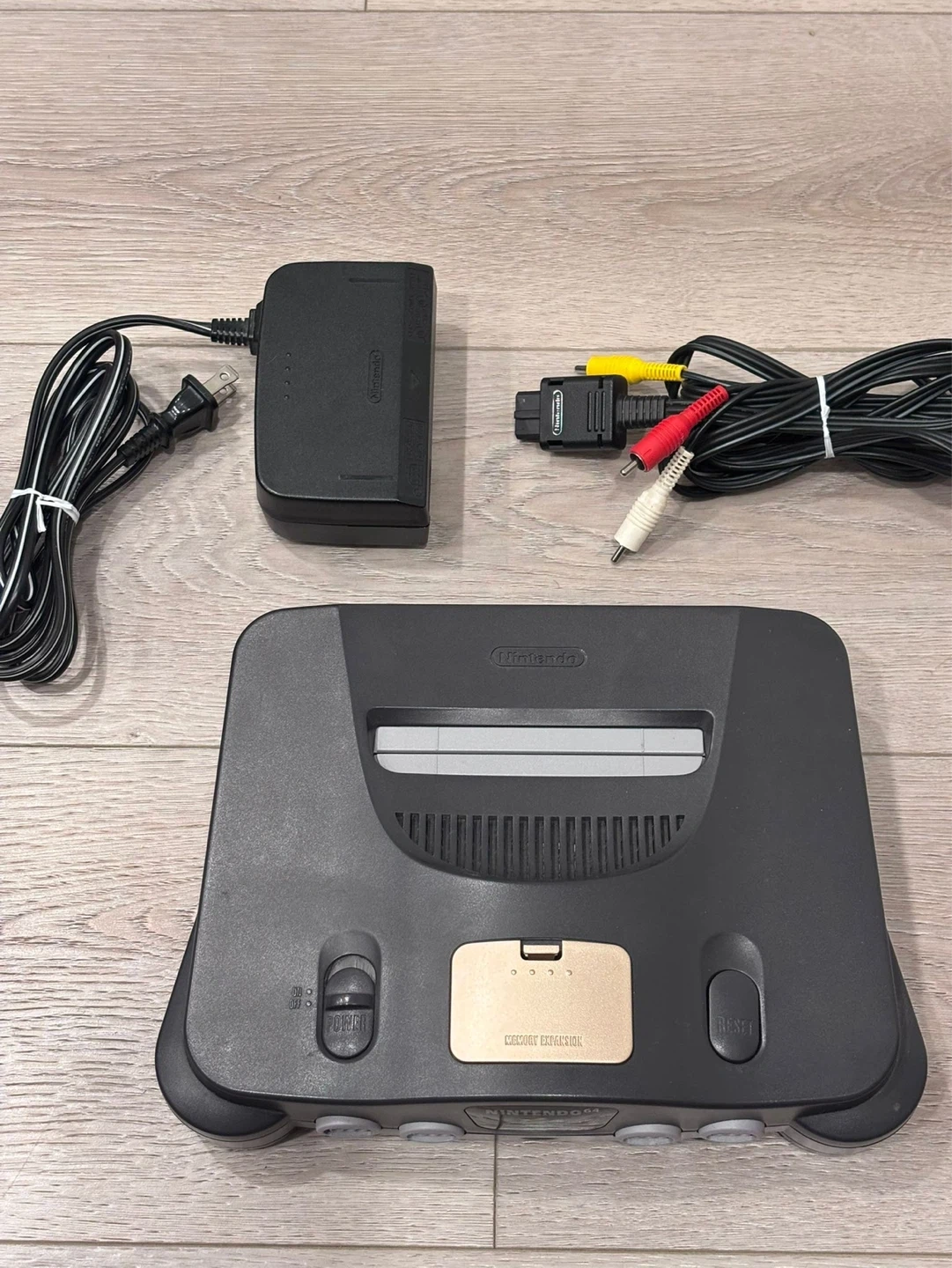 -Original black N64 console, a set of N64 A/V cables and N64 Power adaptor.