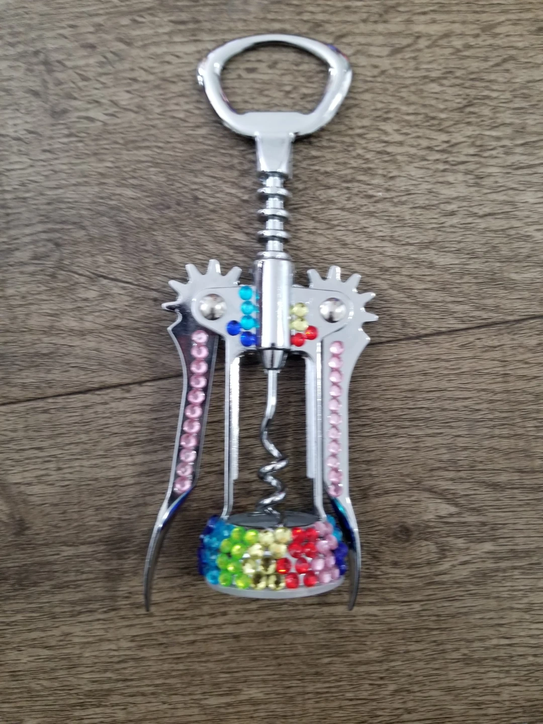 This corkscrew is decorated with colourful rhinestones. It's made of durable metal and has a classic design for opening wine bottles. Great for adding a touch of sparkle to your kitchen or bar! Brand new