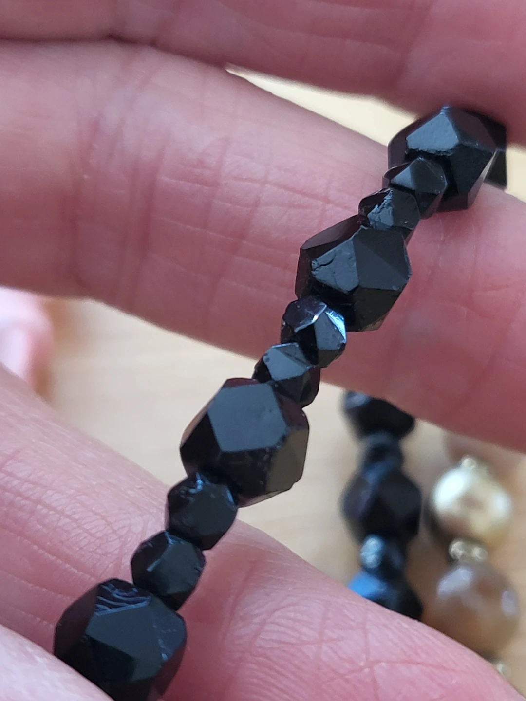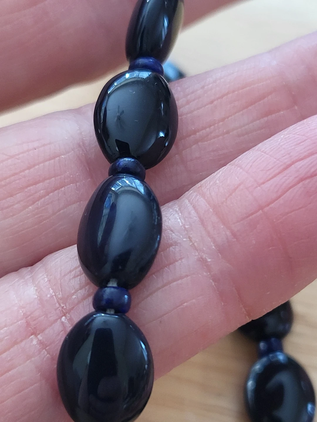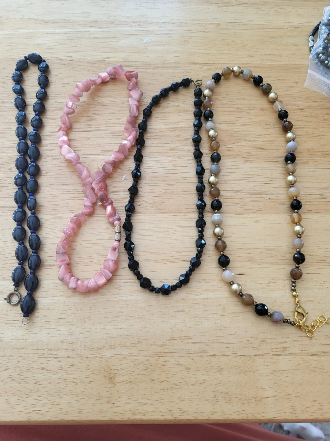 Includes one dark blue oval glass necklace, one pink irregular stone necklace, one black faceted glass necklace, and one multi-coloured faceted bead necklace. Various bead materials and sizes.
