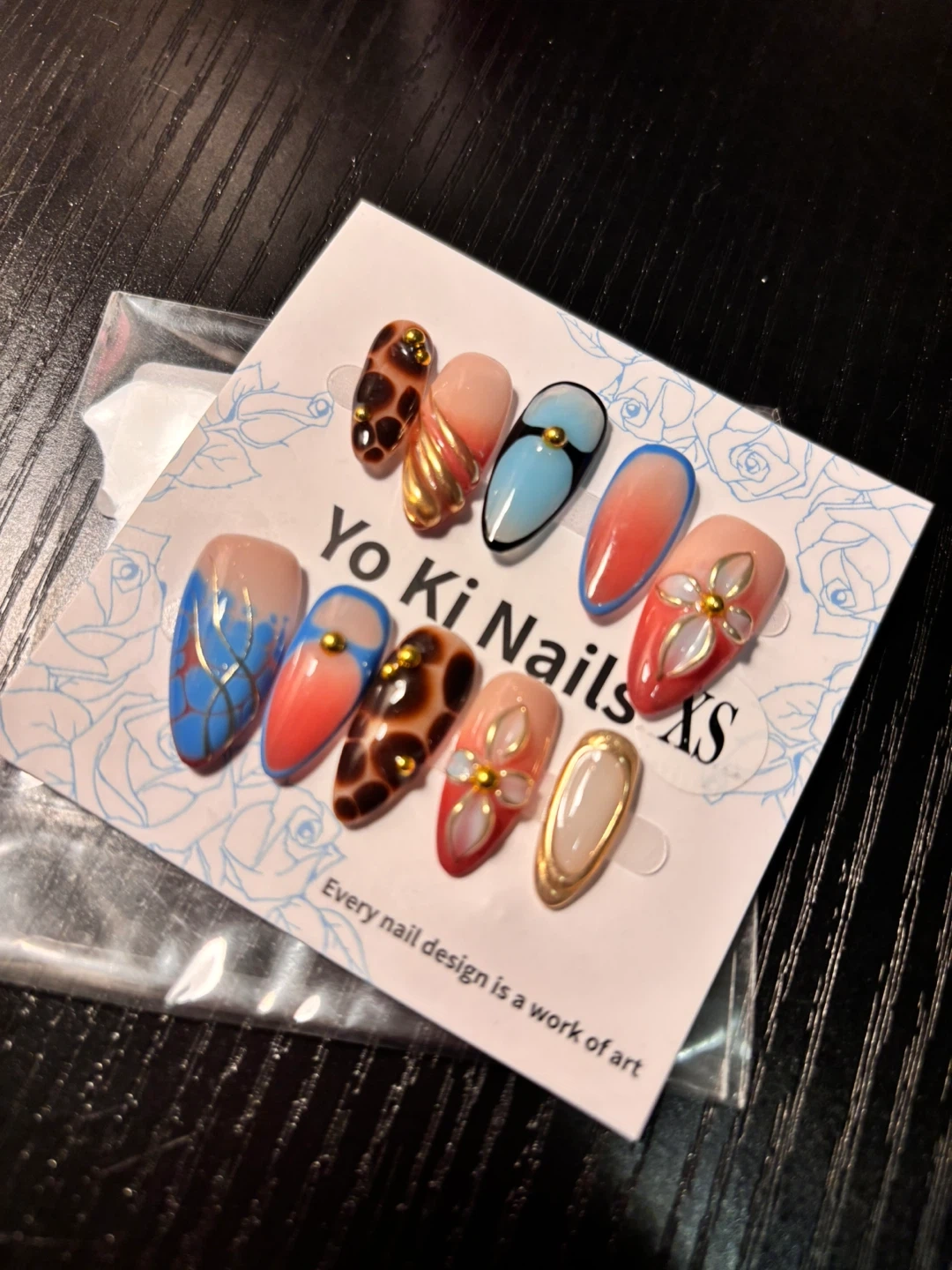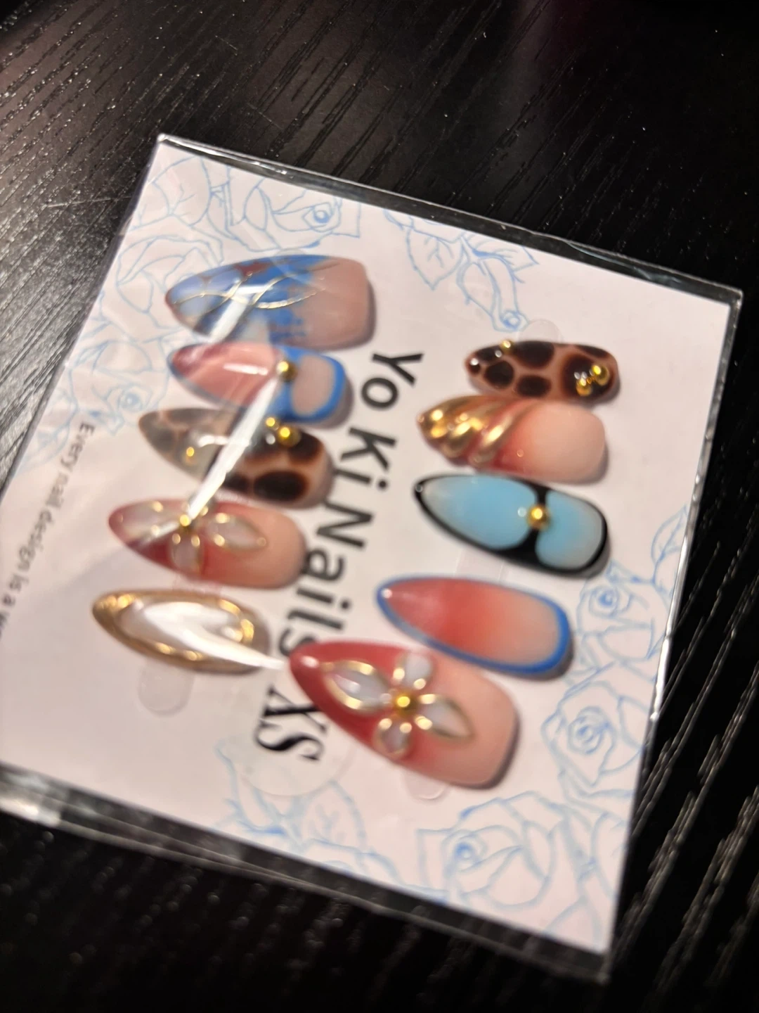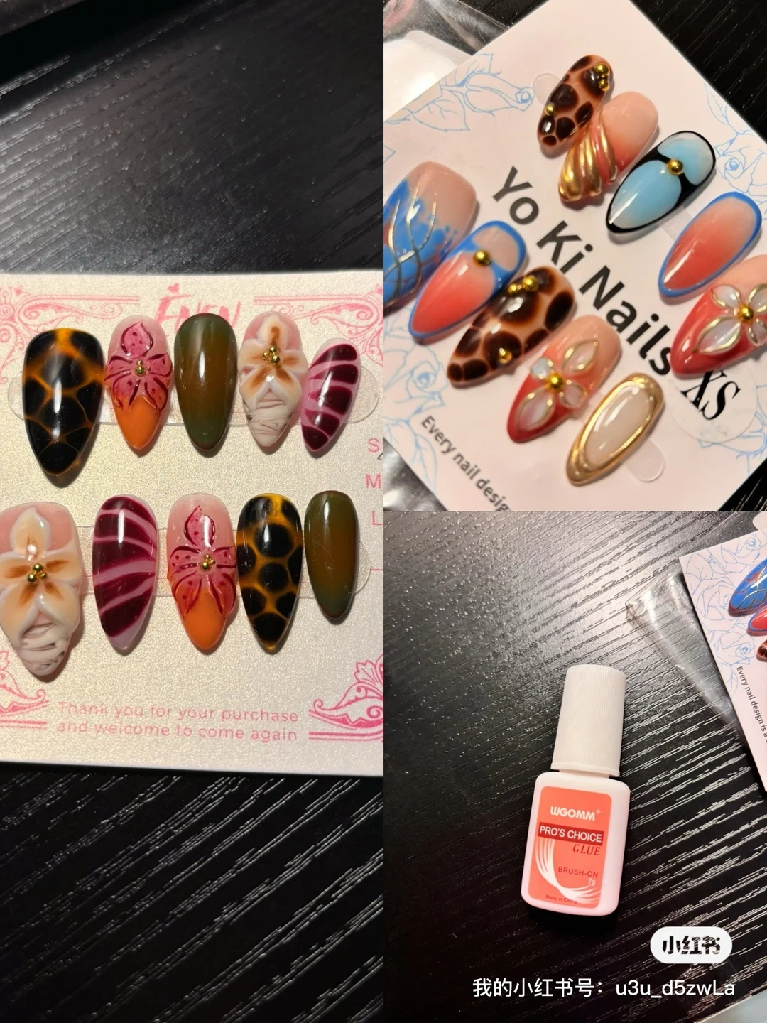 Set of 10 assorted press-on nails with unique designs like leopard print, floral patterns, and ombre. Includes a bottle of WGOMM Pro's Choice Brush-On Glue. Original prices each r above 13