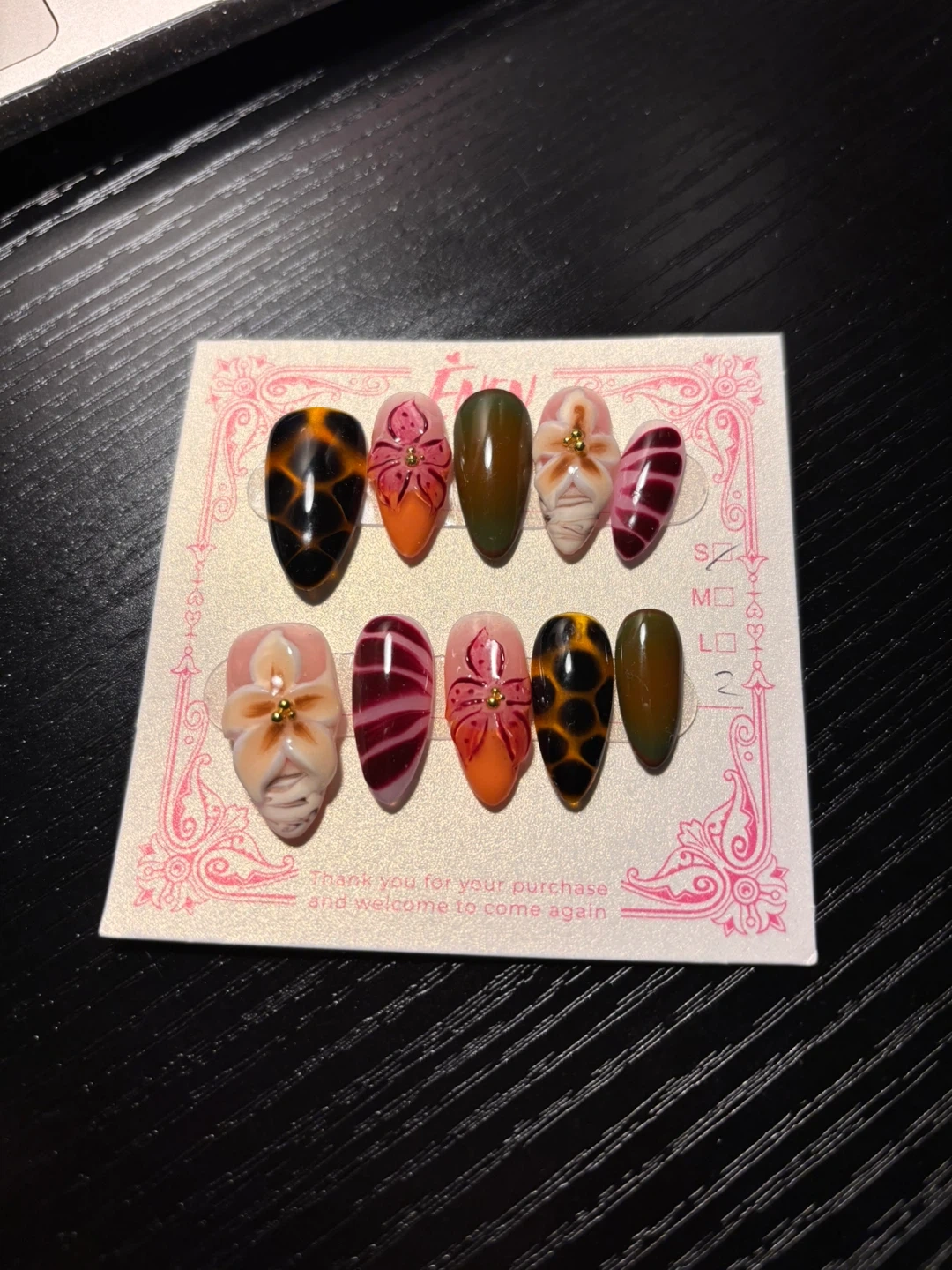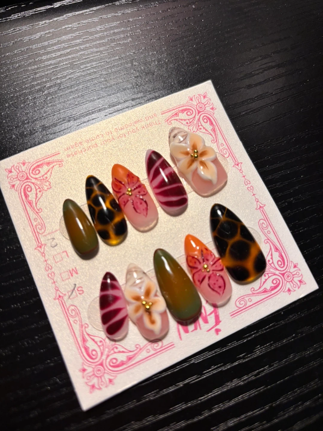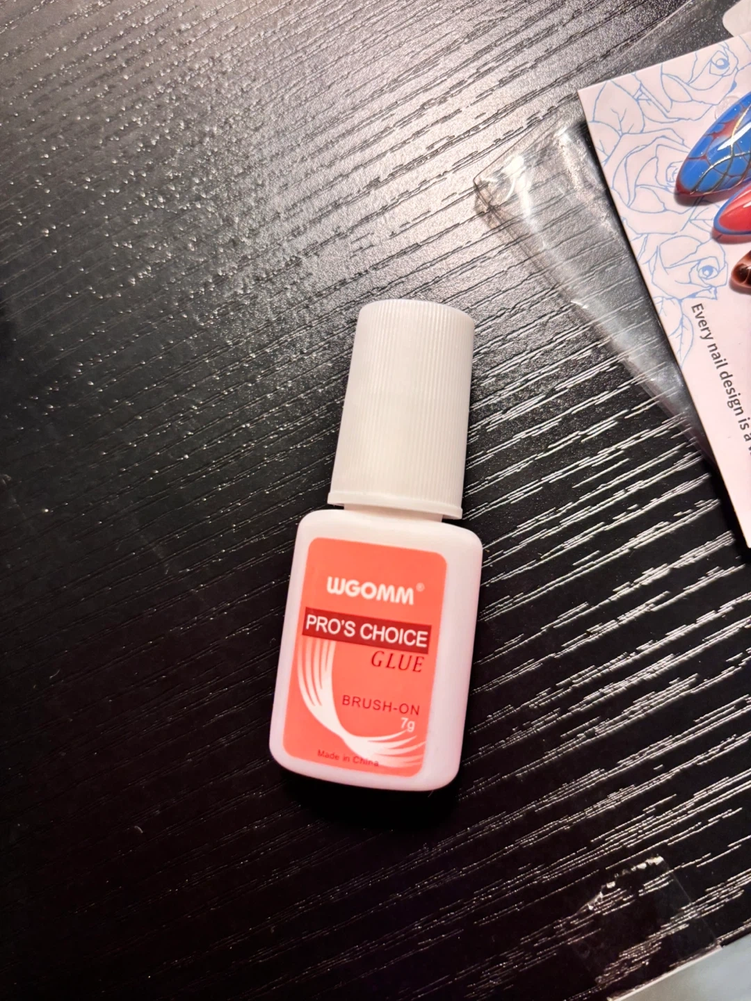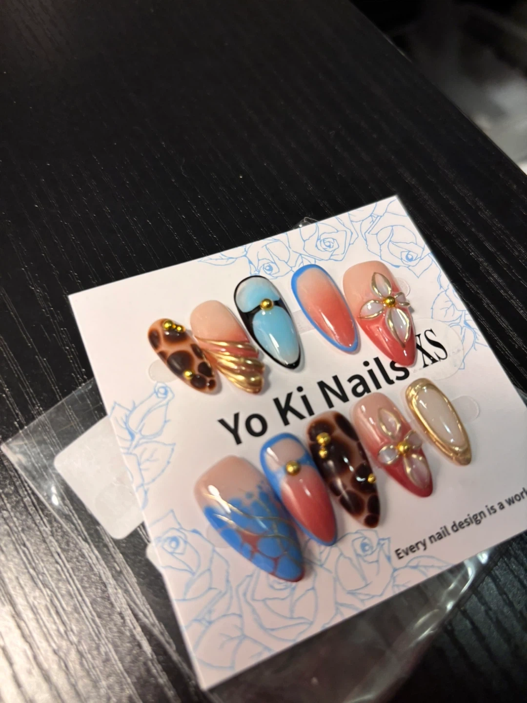 Set of 10 assorted press-on nails with unique designs like leopard print, floral patterns, and ombre. Includes a bottle of WGOMM Pro's Choice Brush-On Glue. Original prices each r above 13