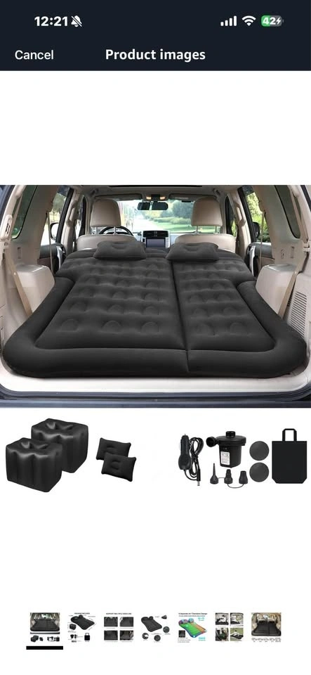 Includes inflatable SUV mattress, electric air pump, inflatable pillows, and carry/storage bags. Fits most SUVs, made with durable, leak-resistant material. Fast inflation/deflation and compact for easy storage. Used only once for a trip. Selling because I don't need it anymore.