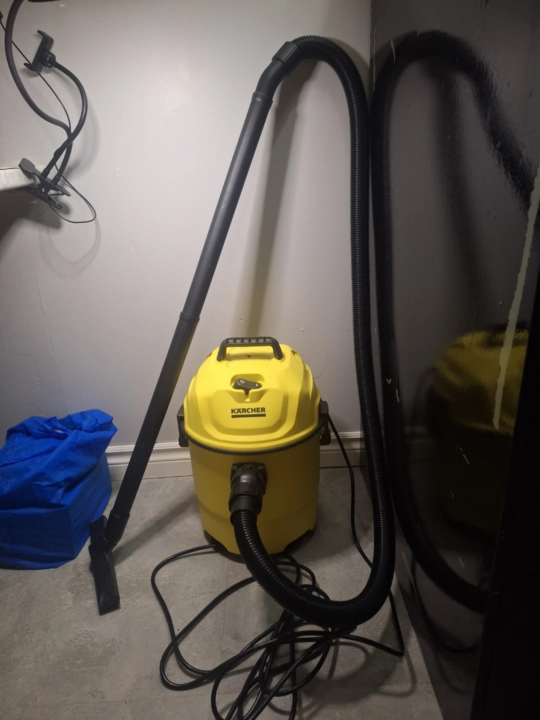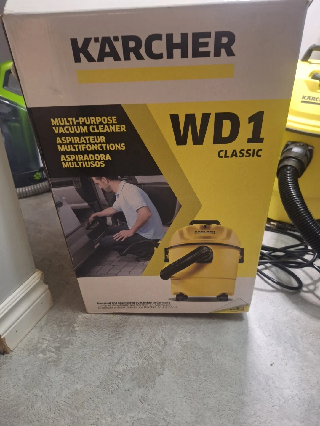 Kärcher WD 1 Classic multi-purpose vacuum cleaner. Wet and dry vacuuming capabilities. Comes with a hose and nozzle attachment.