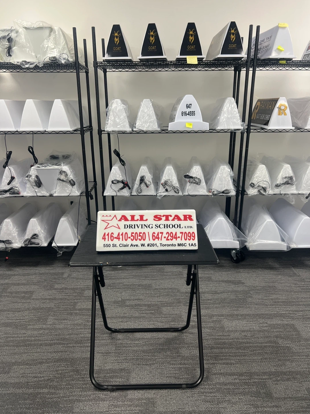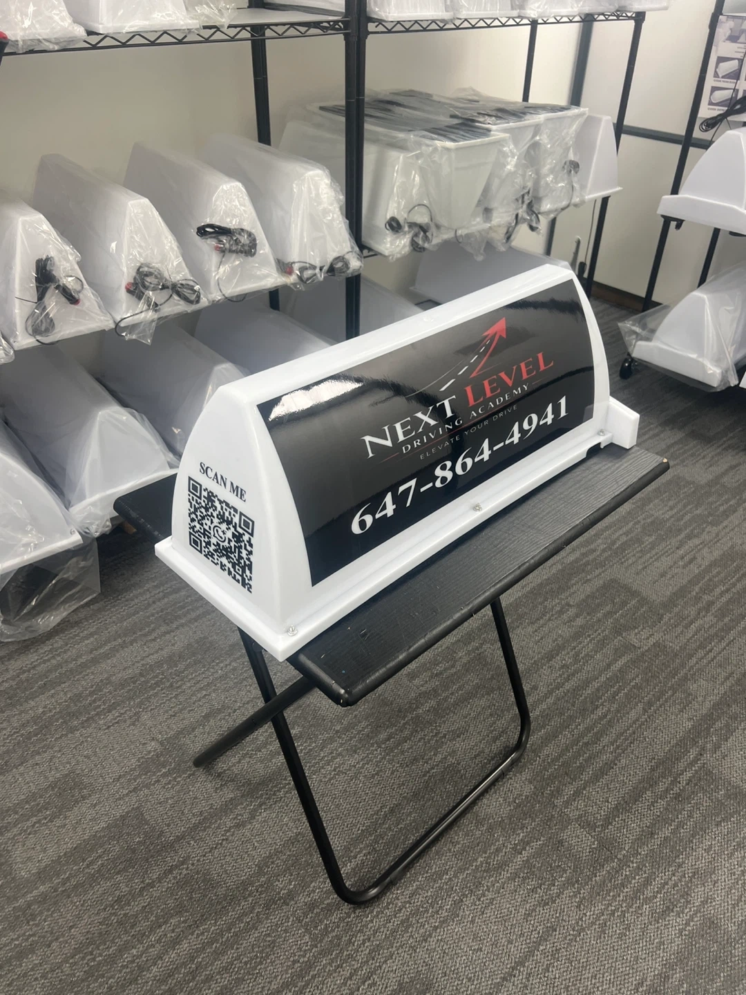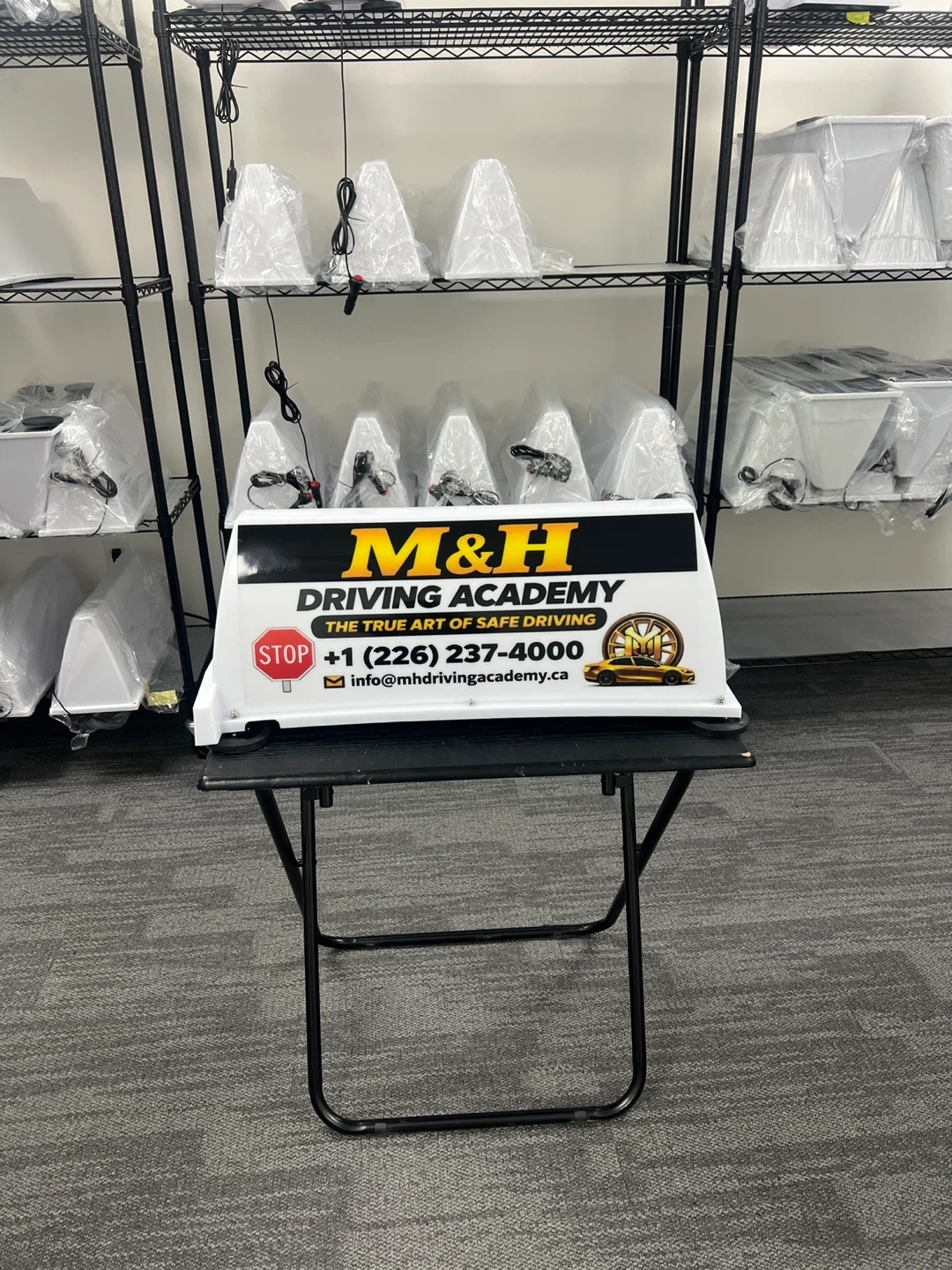 This is a roof sign board for a driving school advertising . It displays a phone number and the academy's name. It's designed to be visible for advertising purposes. Great for use on a vehicle or at a business location!