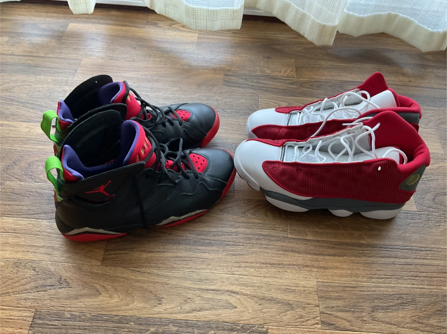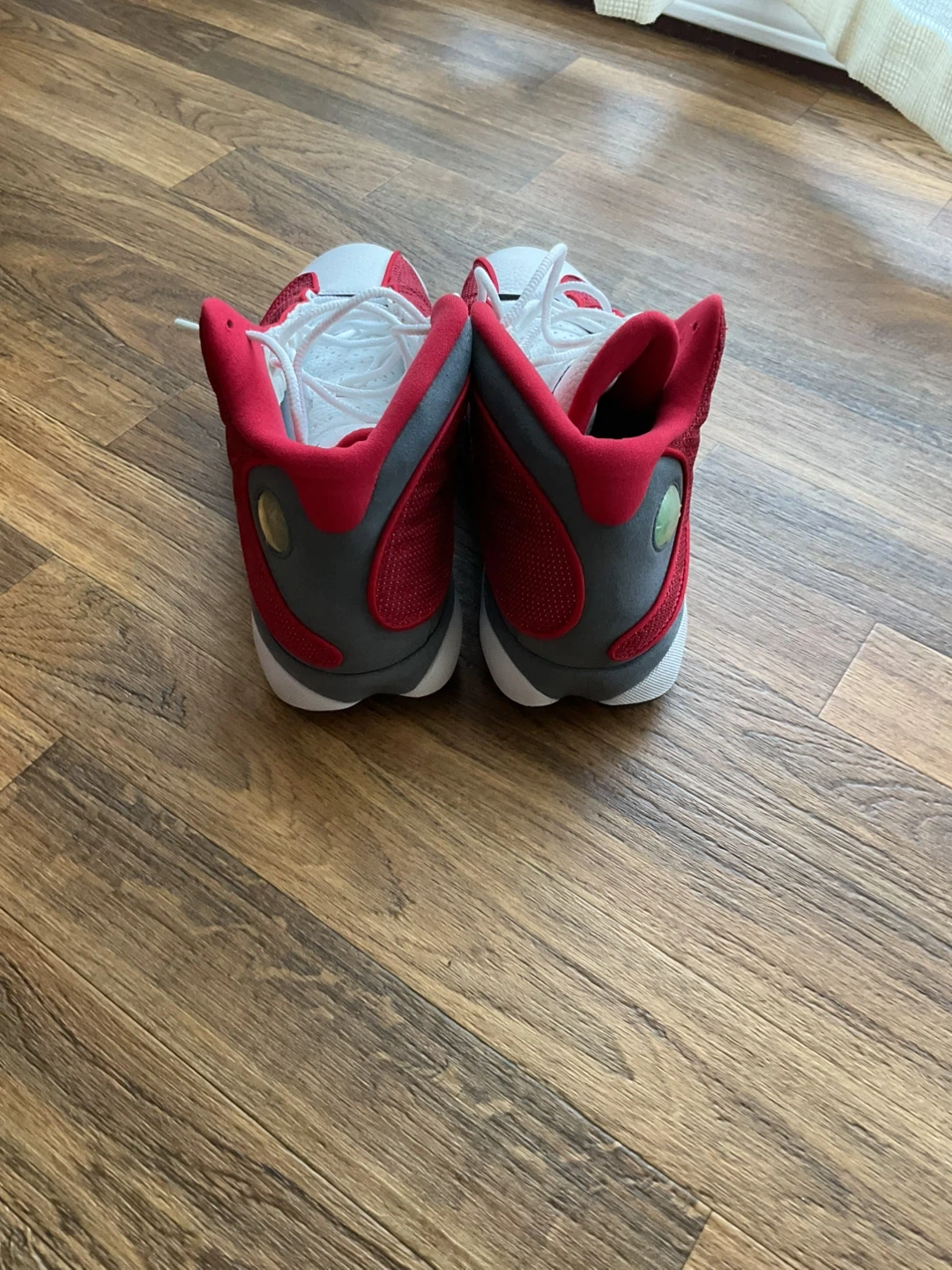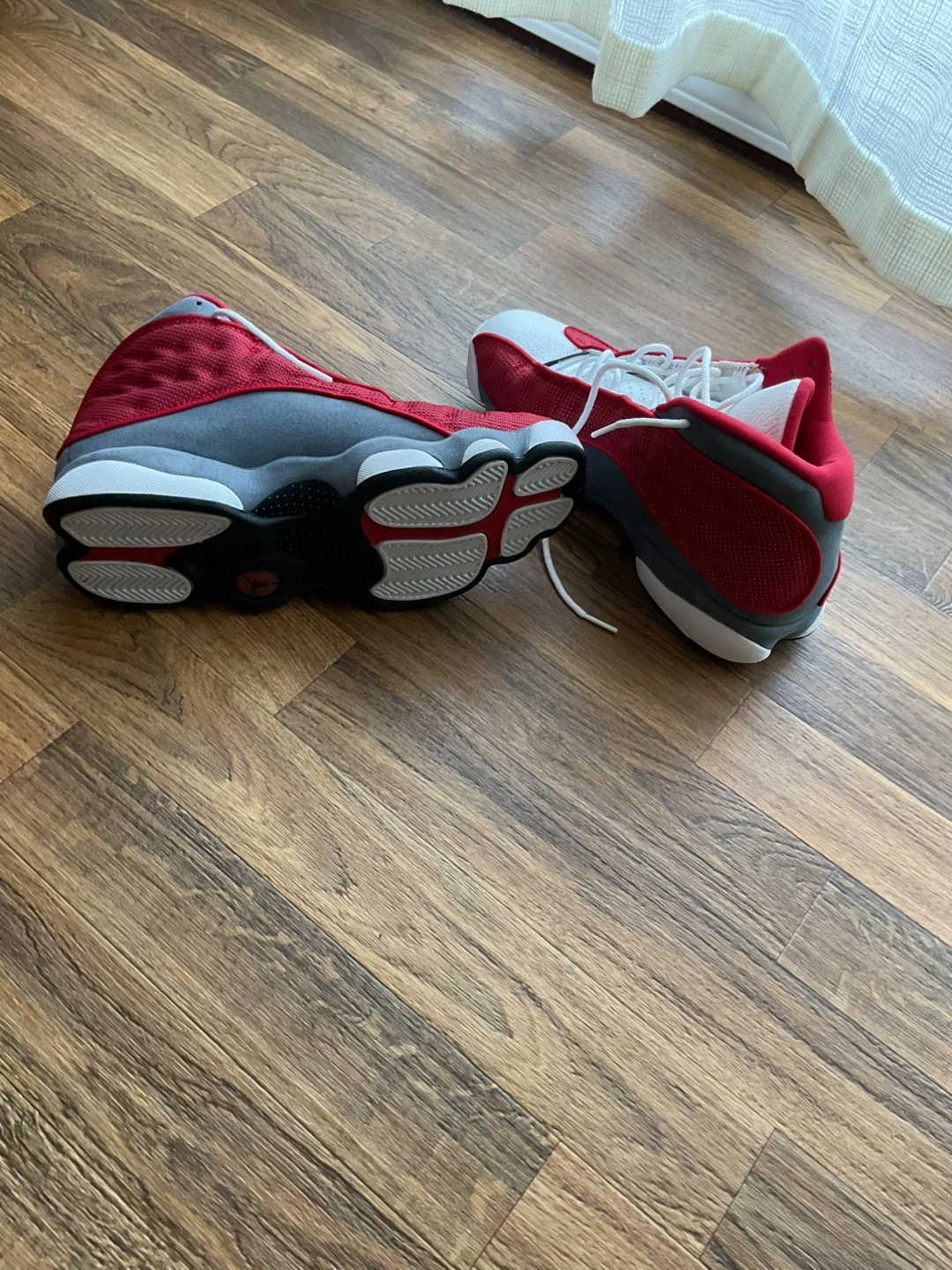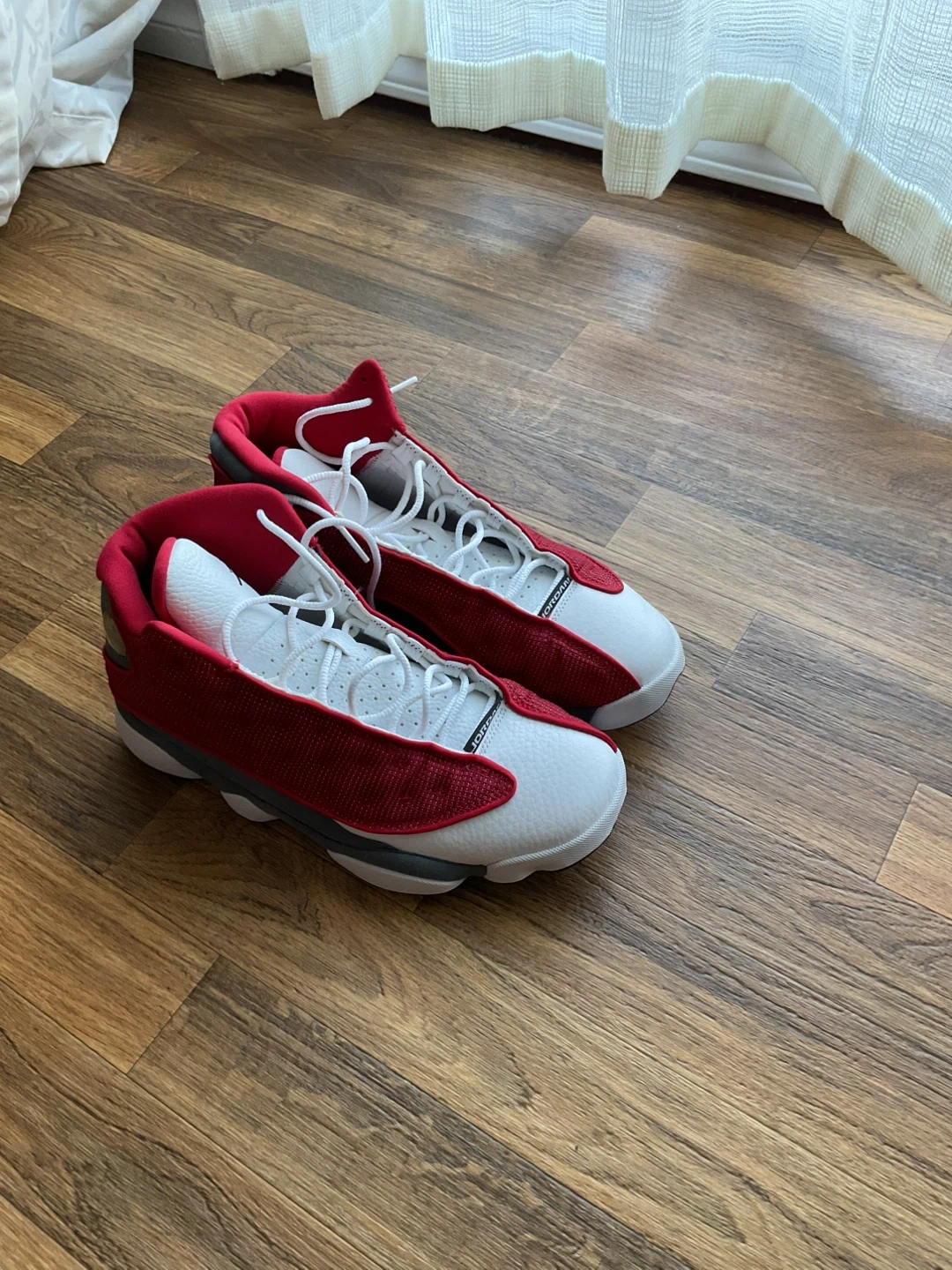 These are Air Jordan 13 Retro sneakers in a red and white colourway. They feature a leather and textile upper with a rubber sole. A classic sneaker design for any collection. Jordan 7 Mars is free.