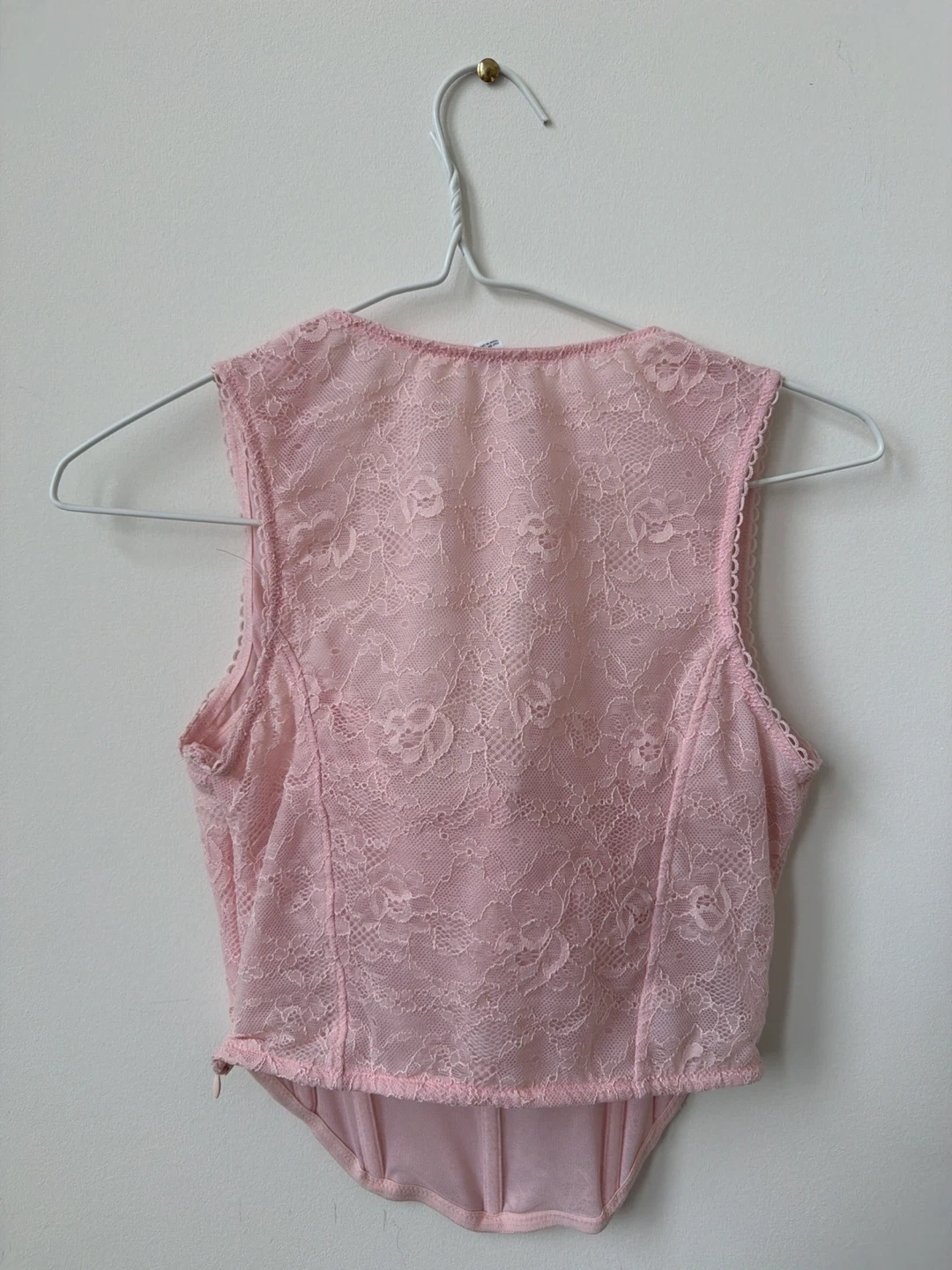 This is a pink lace corset top from Garage. It's a size P/S. It has a zippered closure on the side. been worn once! but does have a light cosmetic blemish but very faint and could probably be removed.