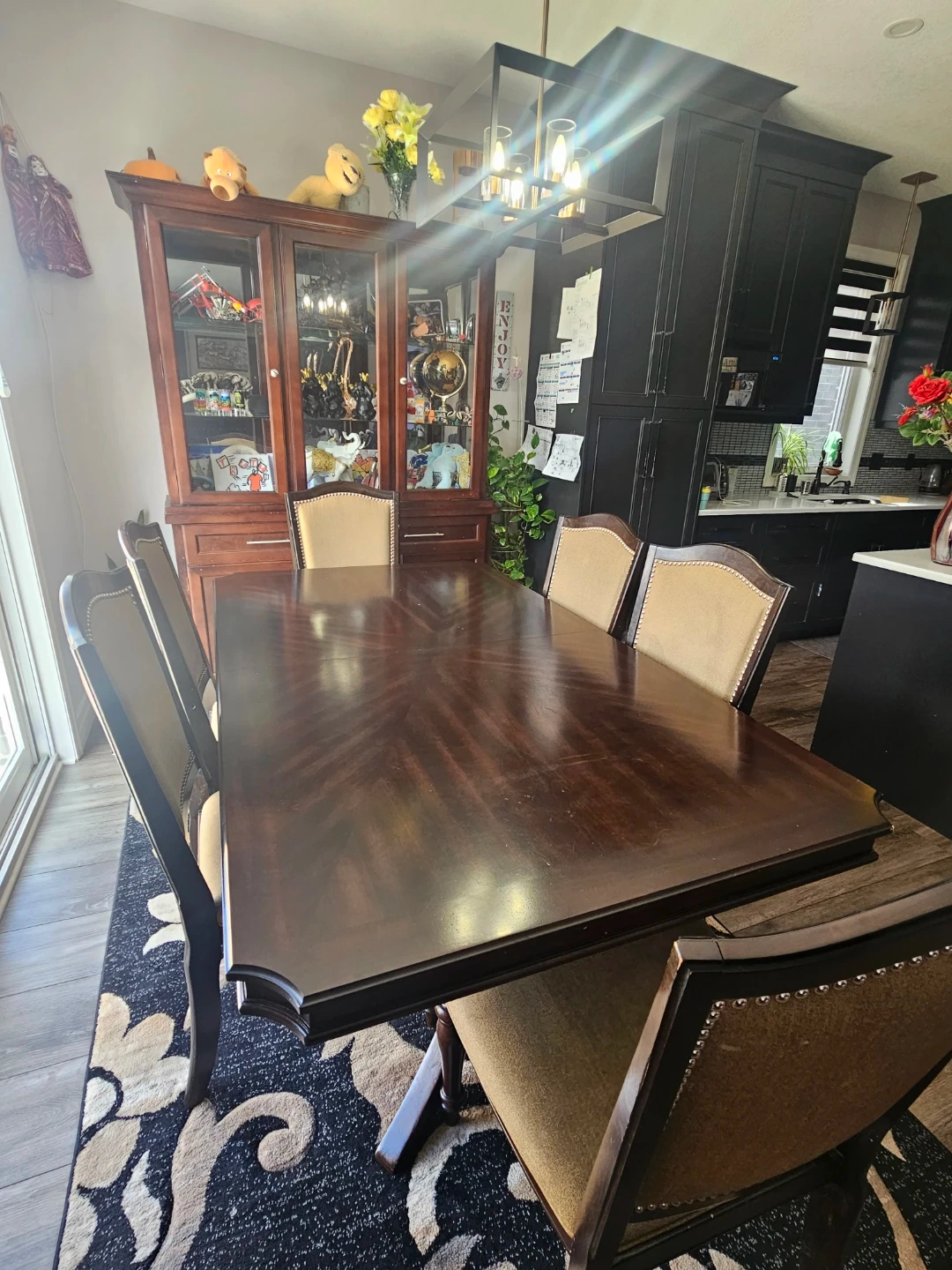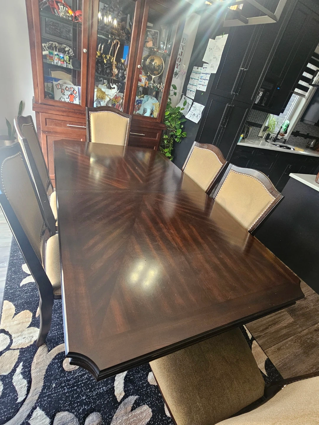 This is a dark wood dining table with a detailed wood grain pattern on the surface. It comes with six upholstered chairs that have nailhead trim. The table and chairs have a classic design.