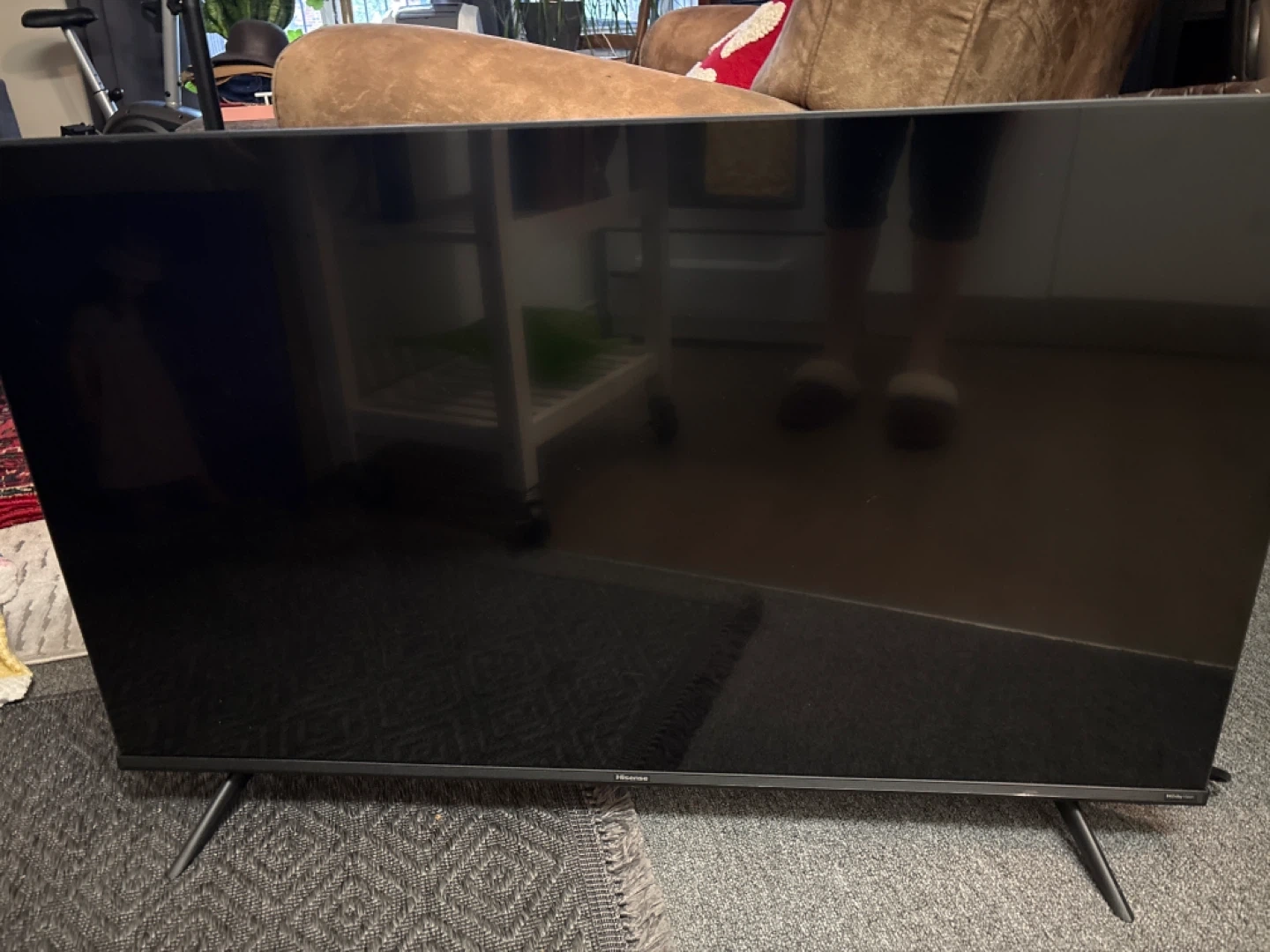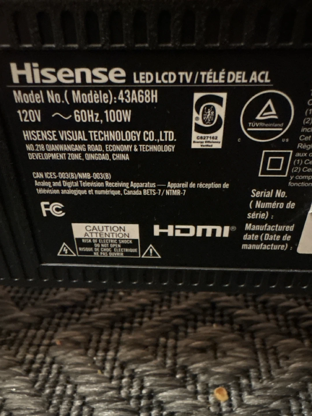 Model 43A68H with manual. This TV was used for 1 1/2 years, and had the following issue: occasionally, over about a year, the screen shows black, cloudy or smoky/hazy appearing blotches. Turning the TV off for a short period clears the screen. This may happen a few times within a couple of weeks, then not again for six months or more. This TV may last for years, or only months, it’s impossible to tell. Thus the $25 price. Other than those transitory “hazy” episodes, the TV works very well, and is undamaged.