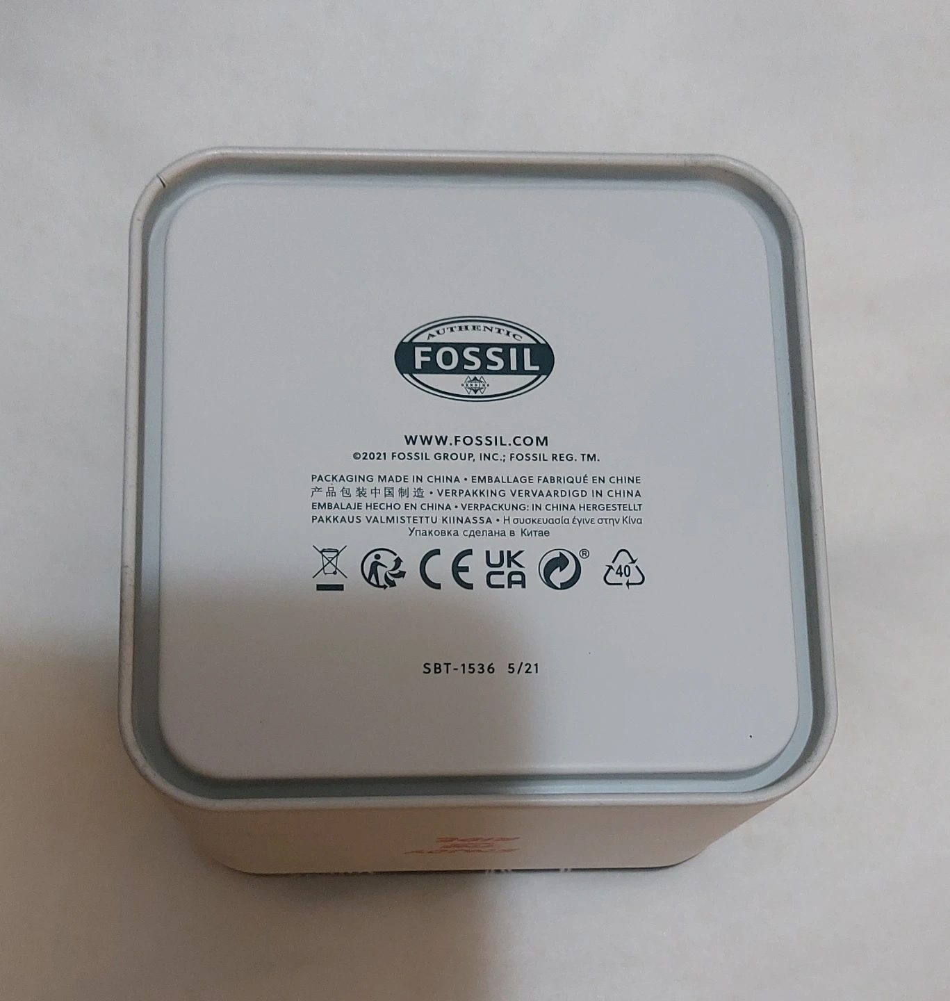 This is a Fossil watch box, including the outer cardboard sleeve and the inner tin case. The tin has a fun, graphic design with a motor racing theme. It's great for storing watches or other small items.