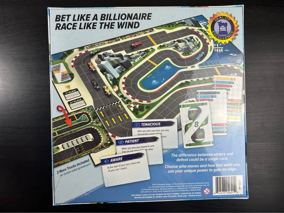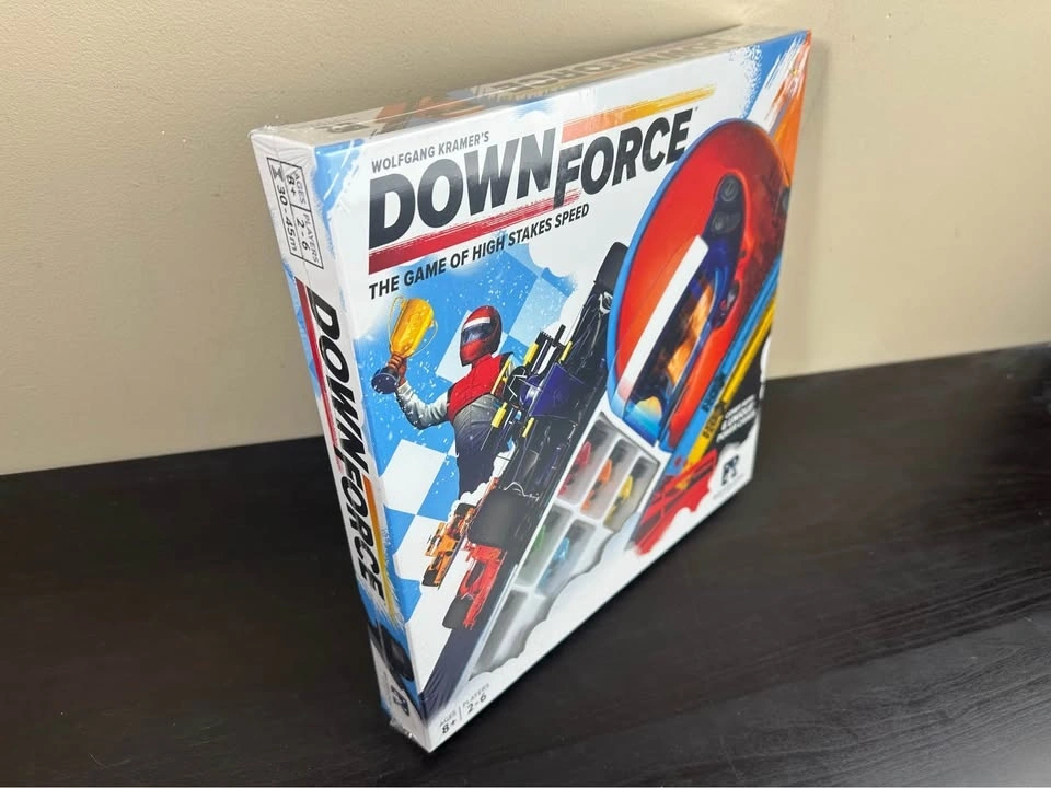 High-stakes bidding on million-dollar race cars. Frantic bets placed in secret even as the cars race around the track. And to the victor, the biggest purse of all. But in the world of motor racing, the margin between victory and defeat can be a single moment: a steep banked turn, tires screaming and spitting out smoke, and the downforce, pressing you down in your seat and keeping you on the track as you make your move inside to pull ahead. Downforce is a card-driven bidding, racing, and betting game for 2-6 players based on Top Race, the award-winning design by the legendary Wolfgang Kramer. Players first bid to own the six cars in the race, then they play cards from their hand to speed them around the track. However, most cards will also move their opponents' cars. So figuring out just the right time to play a card is the key to victory. Along the way, players make secret bets on who they think will win the race. Whoever has the most money from their prize money, winning bets, and remaining bank wins. This is a game whose design needed no attention. Years of play and multiple versions have honed it to near perfection. On the contrary, one of the design challenges was figuring which of the many rules modules to incorporate to create the most fun version. Downforce also adds variable player powers to improve replayability. But mostly, it improves the look of the game to make it gorgeous and easy to play. Special attention was paid to the colors, the layout of the cards, the design of the cars, the details on the board, and more.