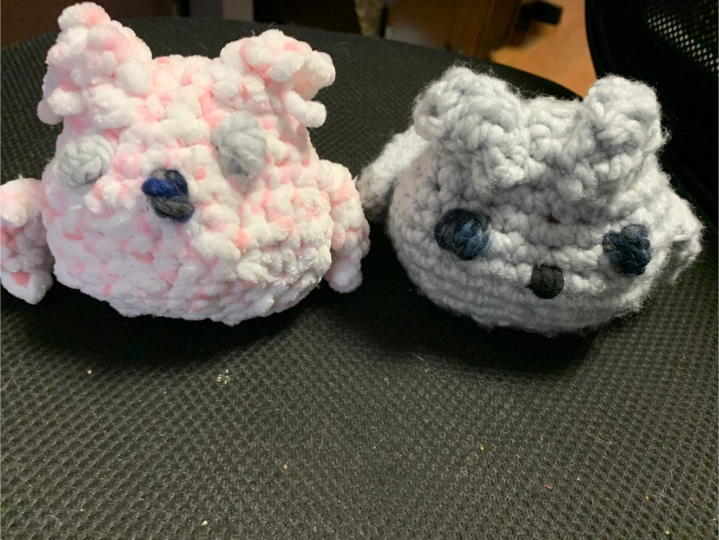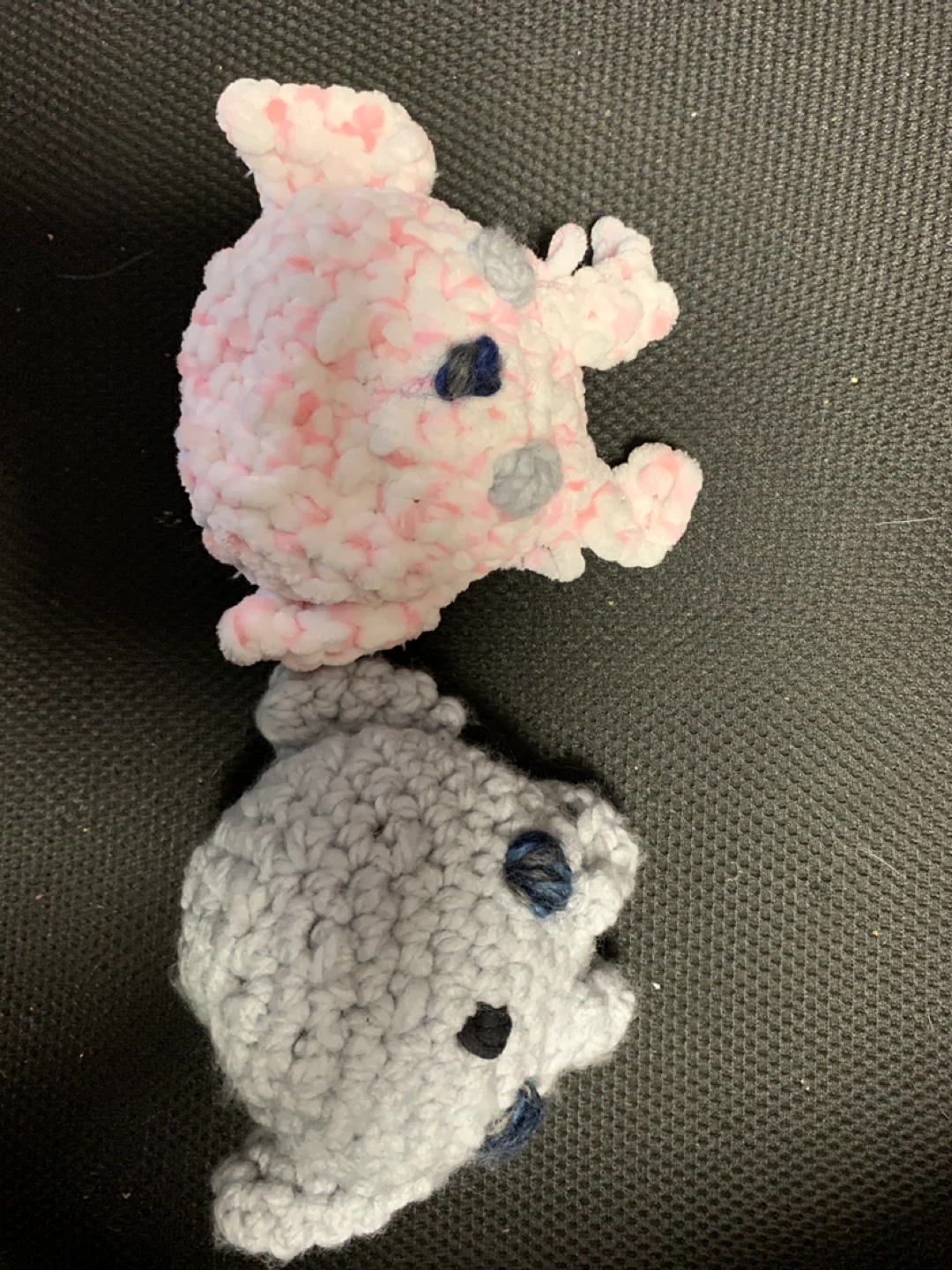 Two adorable, handmade crochet plush toys. One is pink and white, and the other is grey. They're soft and perfect for decoration or play!