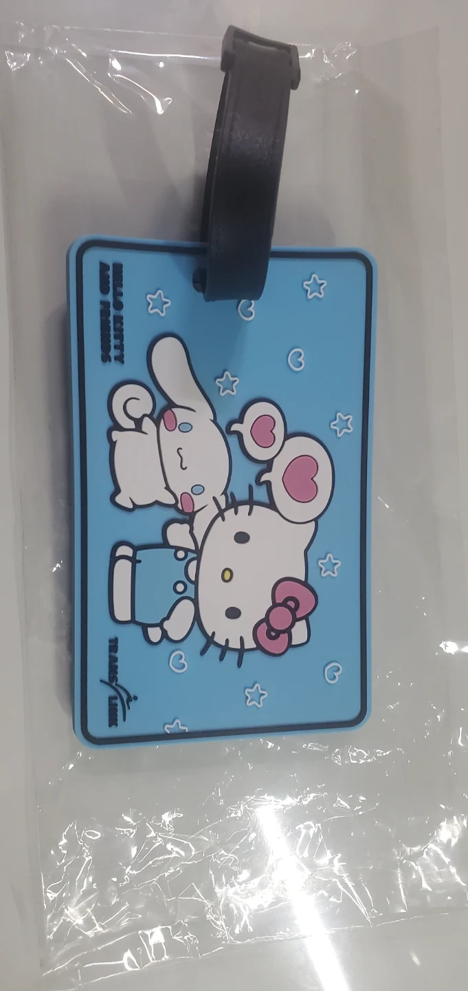 This blue luggage tag features Hello Kitty and Cinnamoroll. It includes a black strap for attachment. Great for identifying your bag!