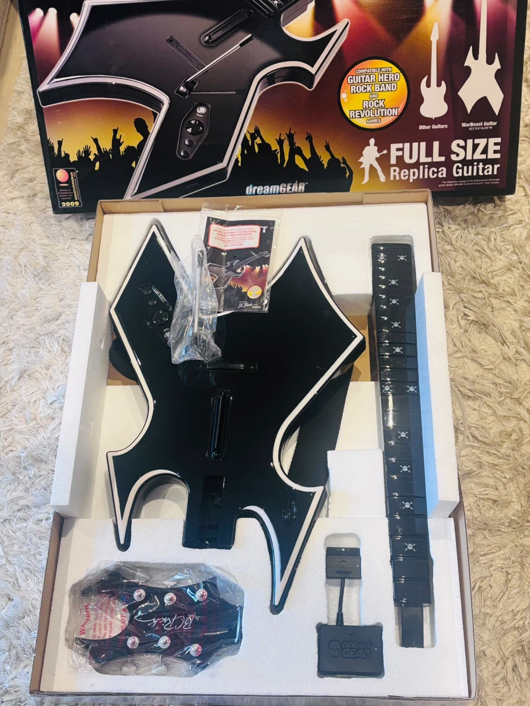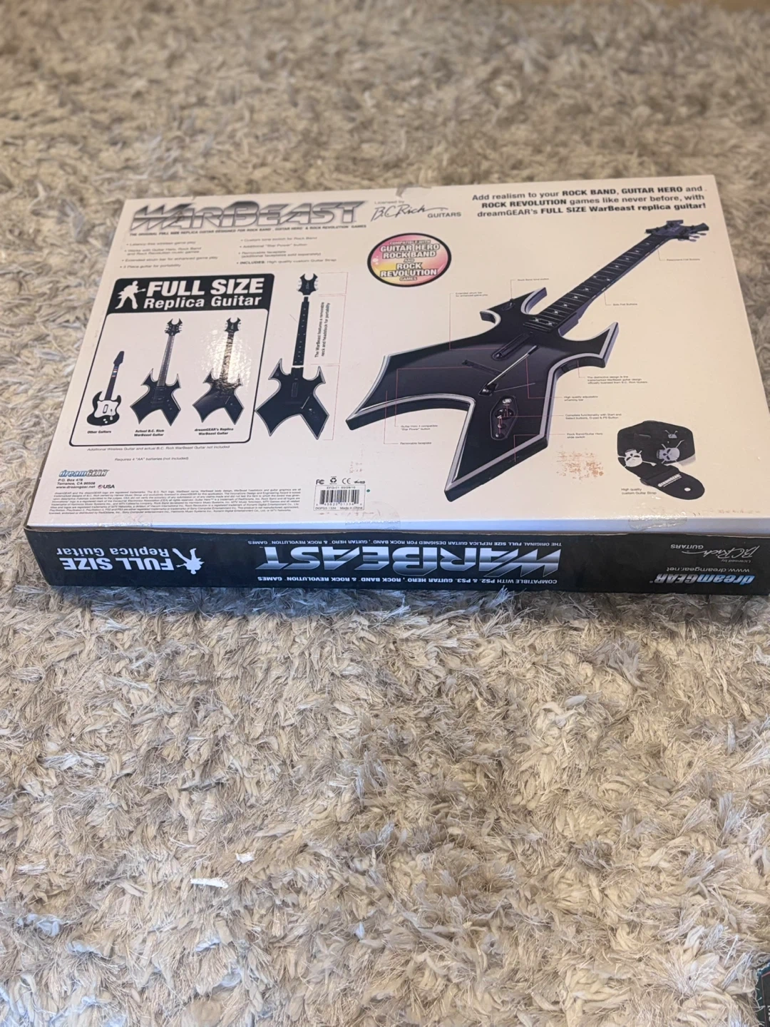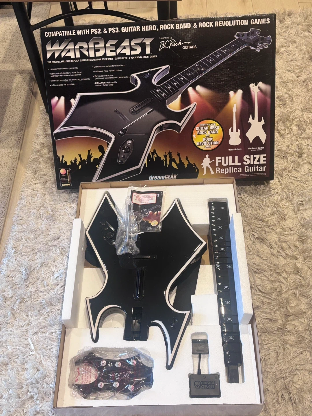 This is the dreamGEAR Warbeast BC Rich full size replica guitar designed for Guitar Hero, Rock Band, and Rock Revolution games. It's compatible with PS2 and PS3 consoles. Latency-free wireless gameplay. Extended strum bar for enhanced gameplay. Three piece guitar for portability. Custom tone switch for Rock Band. Additional Star Power button. It includes HIGH QUALITY custom guitar strap. Never used BEFORE tested it and it works great 👍 I have the original box and the instruction manual