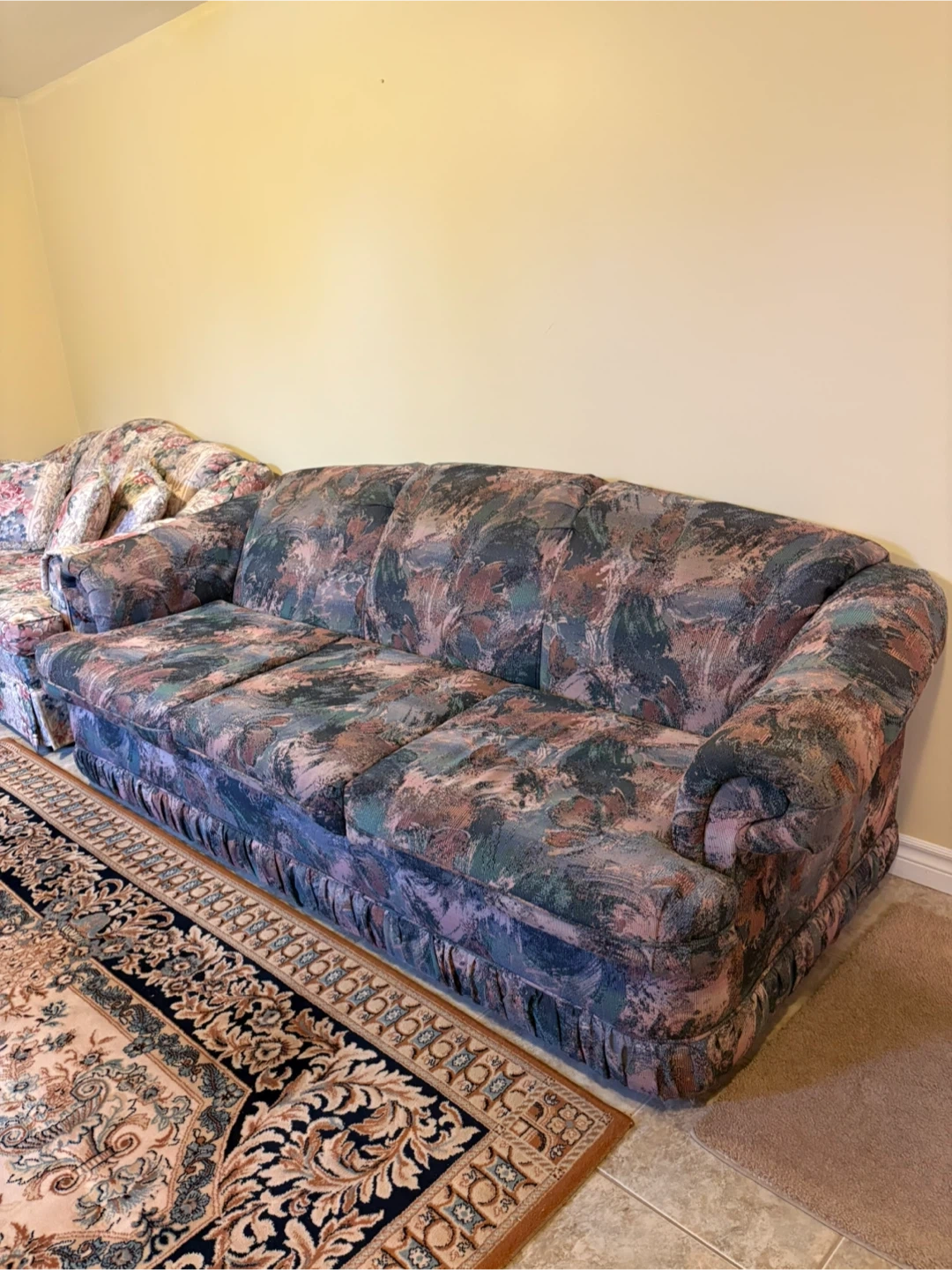 FREE Three-seater sofa and loveseat with a floral pattern upholstery. It features a pleated skirt along the bottom. These sofas would be nice additions to a family room.