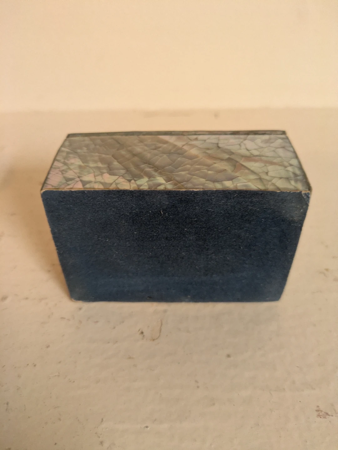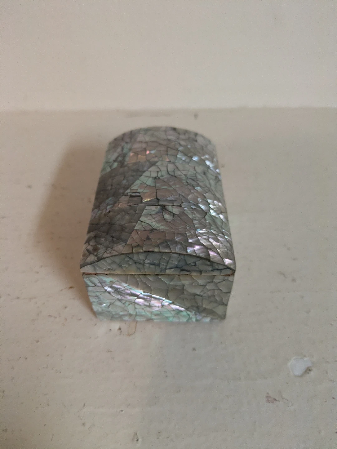 A charming decorative trinket box with an intricate mosaic shell inlay on the lid and exterior. It's filled with a collection of assorted seashells and dried botanical elements. This little box would be lovely for holding small treasures or as a unique decorative piece! Measures 3 x 2 x 1.75 inches