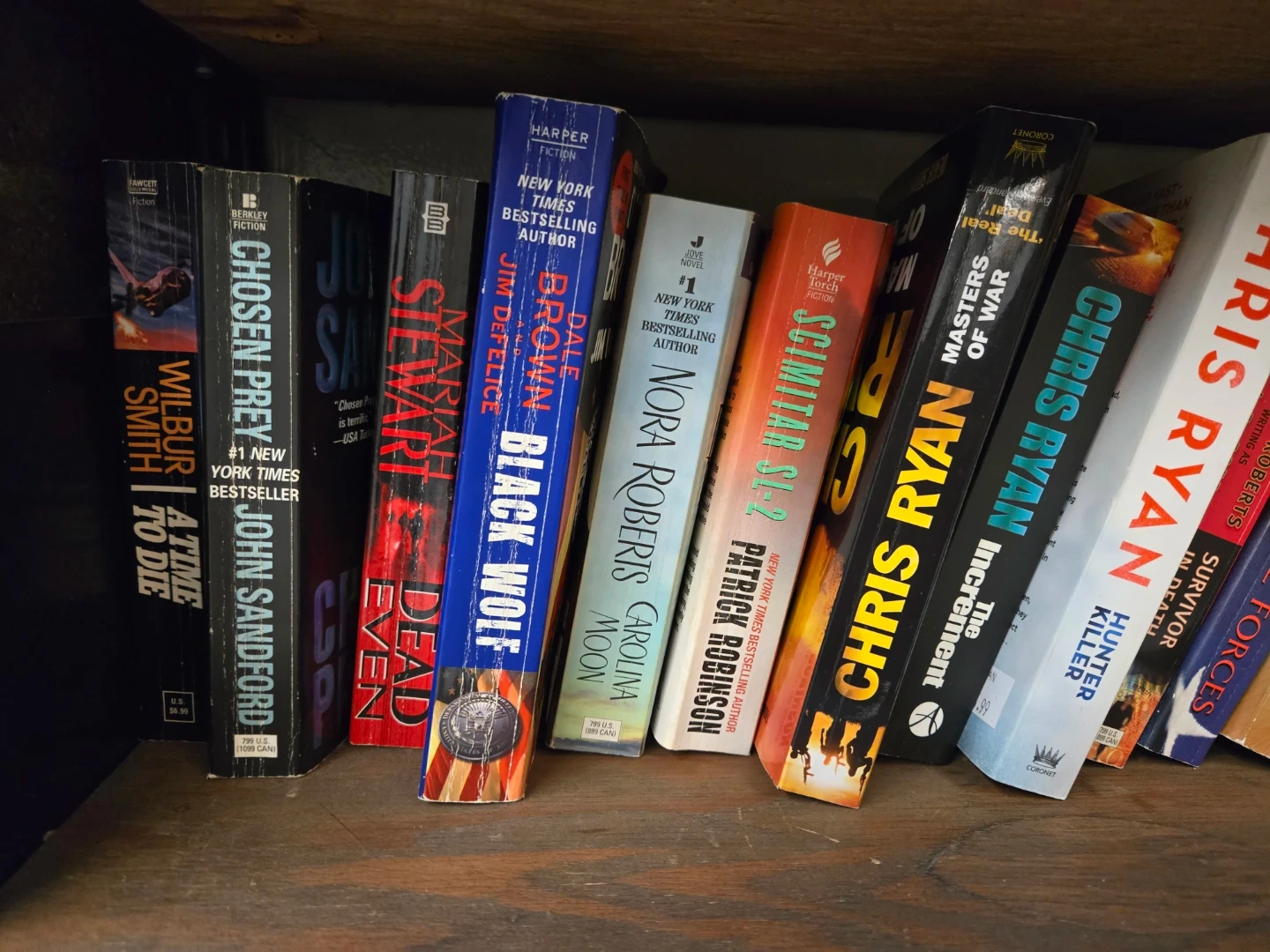 Includes books by Wilbur Smith, John Sandford, Mariah Stewart, Dale Brown, Nora Roberts, and Chris Ryan. These are paperback editions. $5 each