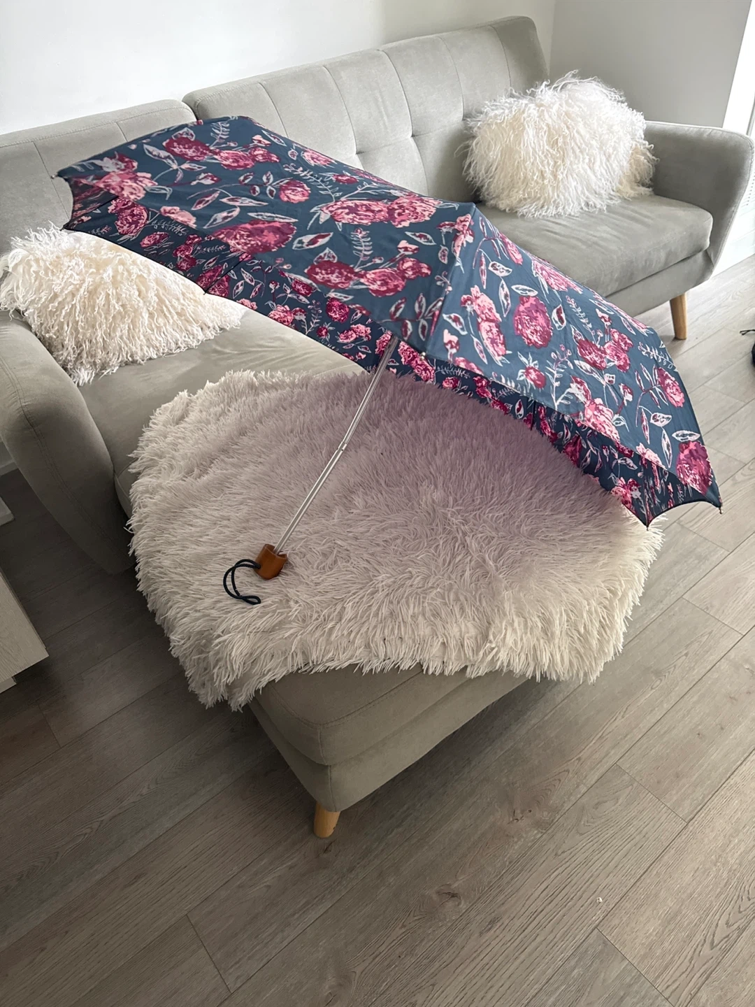 This is a handy compact umbrella with a beautiful floral print. It's designed to be easily foldable and portable. The umbrella has a wooden handle detail and a wrist strap for convenience.