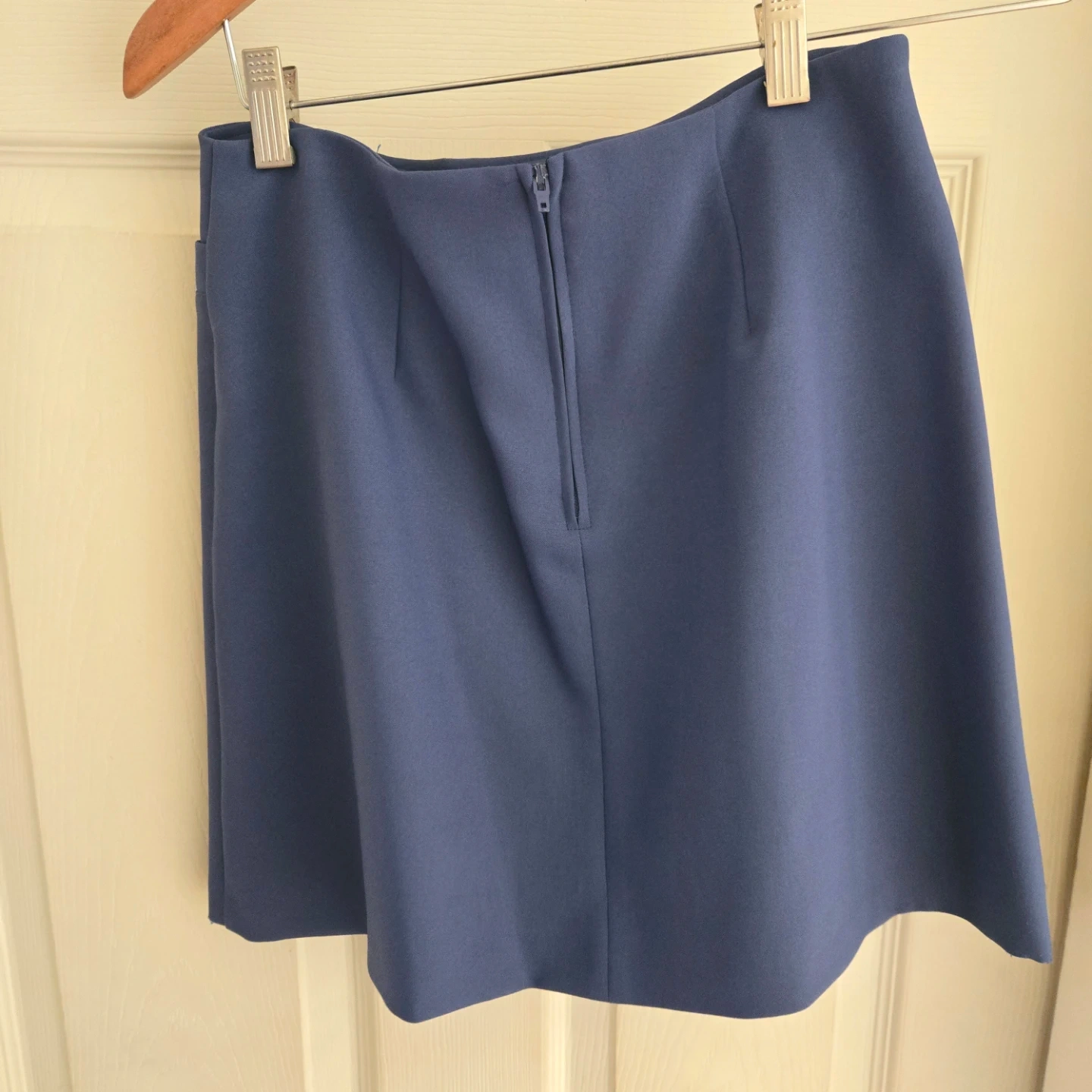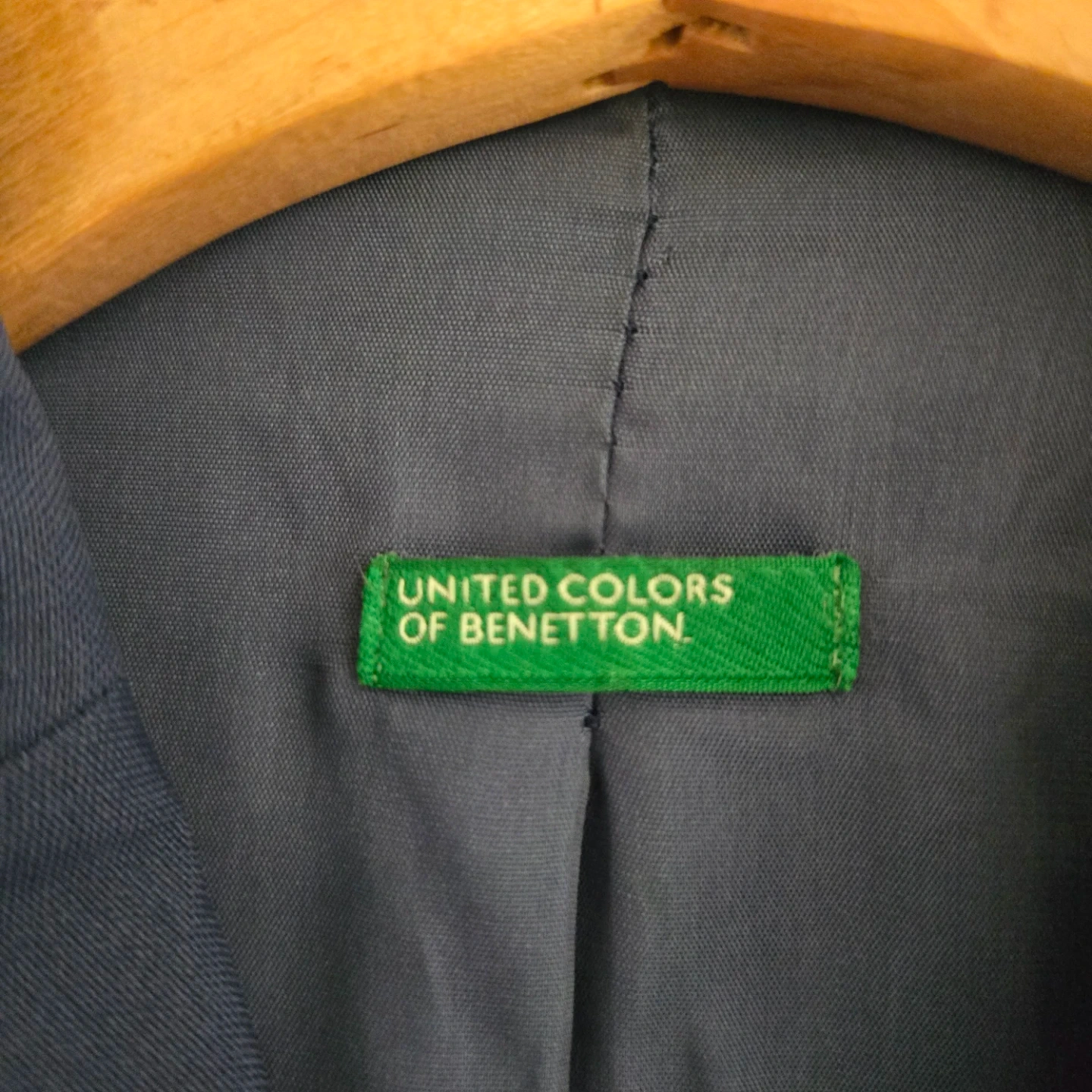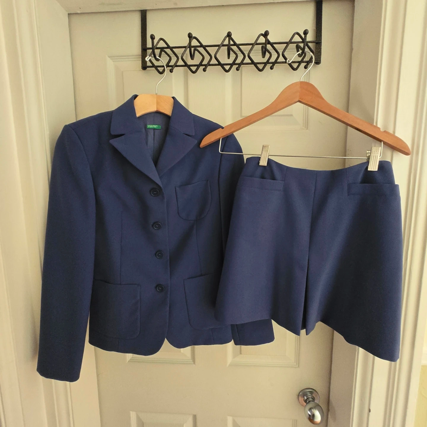 This is a classic blue blazer and skirt set from United Colors of Benetton. It's a lovely navy blue colour. The blazer has a notched lapel and two front pockets. The shorts have a zippered back and two back pockets. Perfect for a smart casual look!