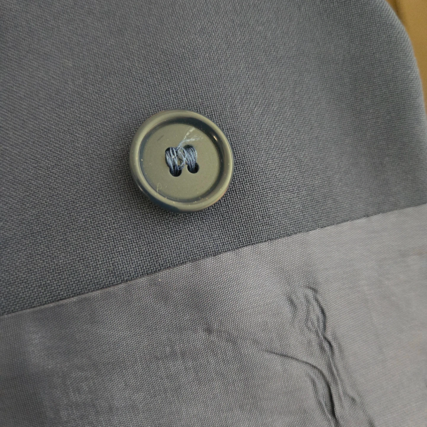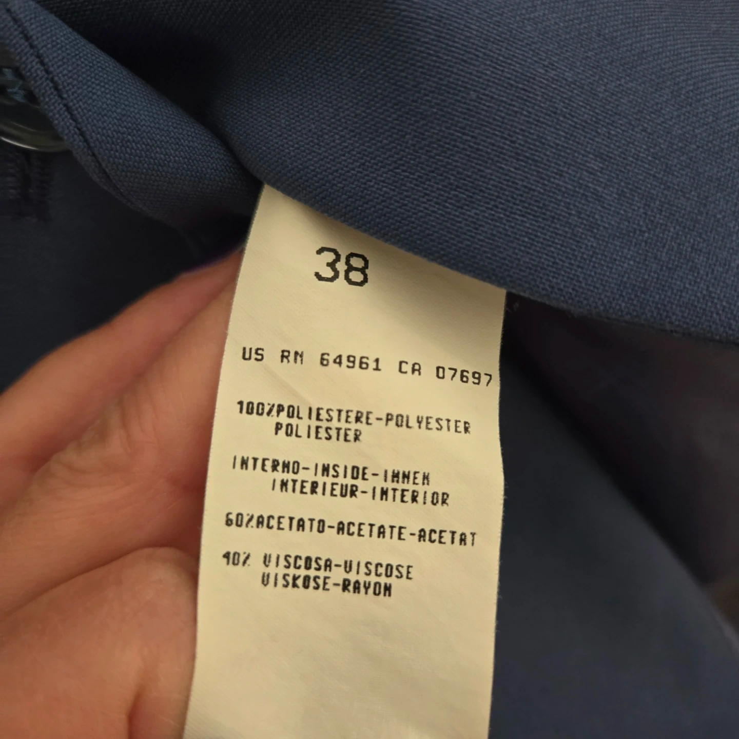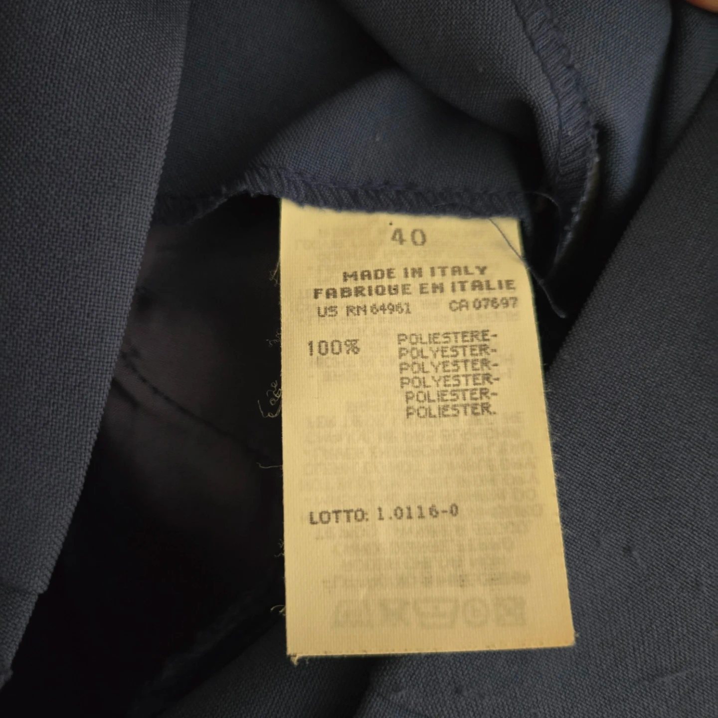This is a classic blue blazer and skirt set from United Colors of Benetton. It's a lovely navy blue colour. The blazer has a notched lapel and two front pockets. The shorts have a zippered back and two back pockets. Perfect for a smart casual look!