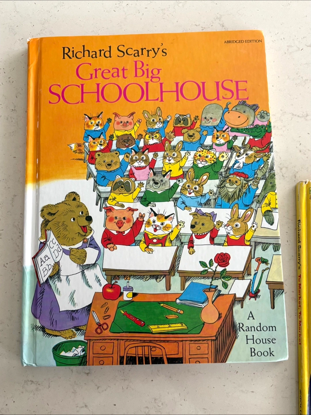 This is Richard Scarry's Great Big Schoolhouse, an abridged edition. It's a Random House Book. Features colourful illustrations of animals in a classroom setting.