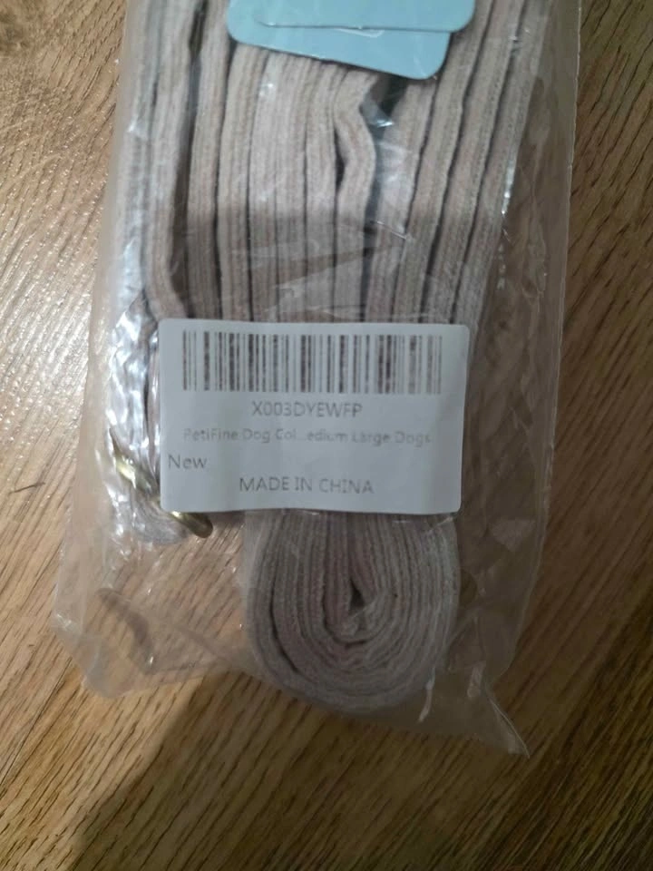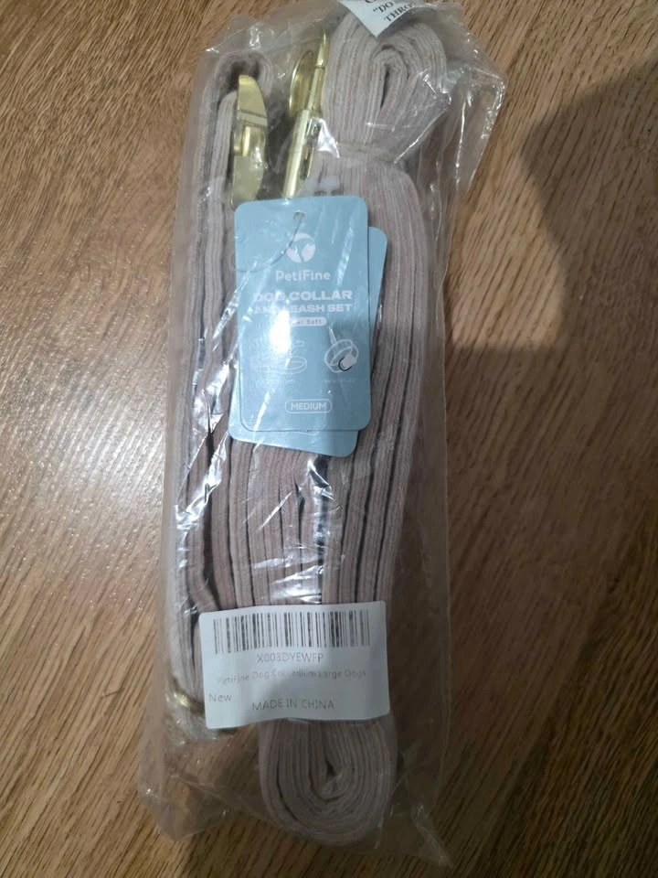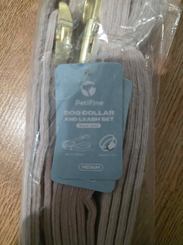 Soft blush velvet with gold tone hardware. Matching collar and leash. Clean, stylish, and simple. Adjustable fit with a strong metal buckle. Brand new and sealed.
