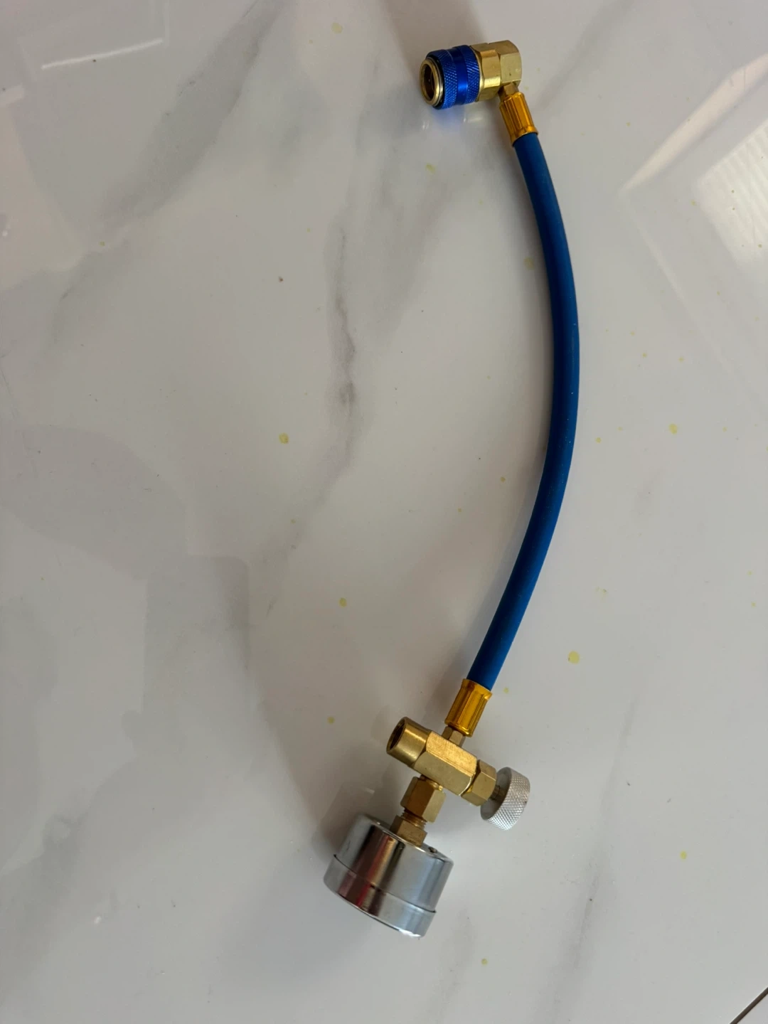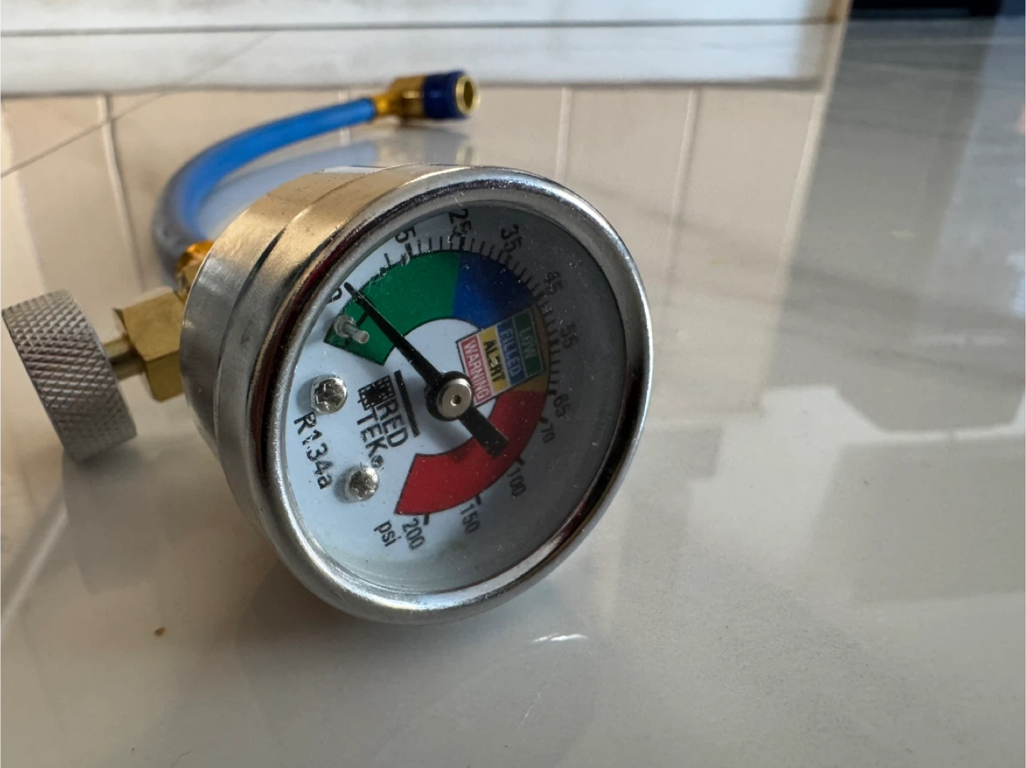 This is a RED-TEK R134a manifold gauge set. It has a pressure gauge reading in psi. The hose is blue with brass fittings. Includes a brass valve control knob.