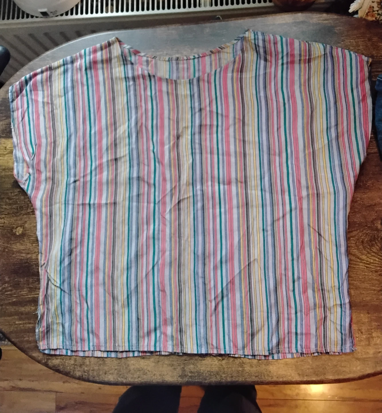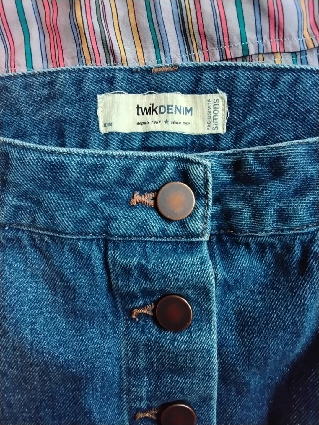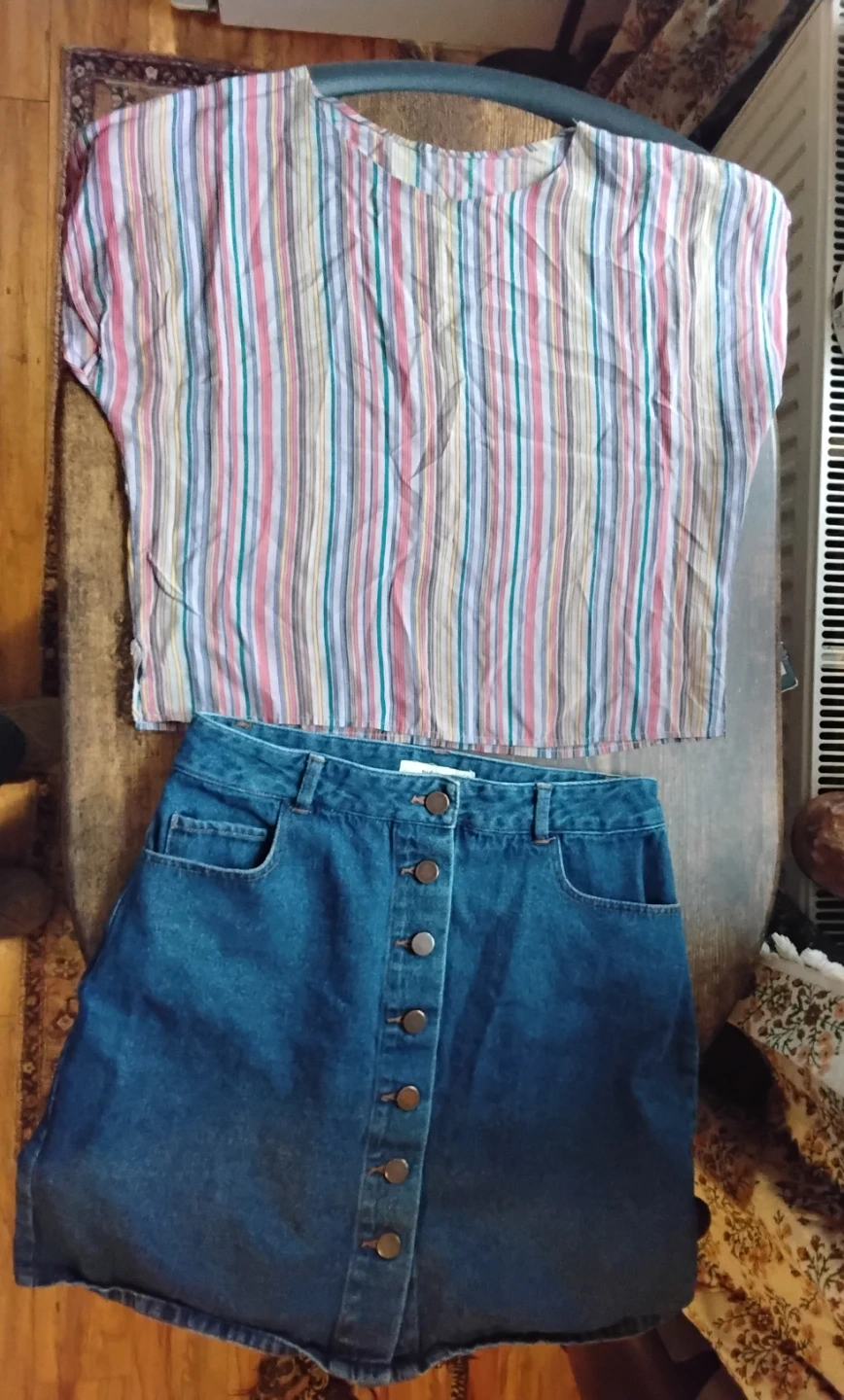 This set includes a twikDENIM jean skirt and a colourful striped blouse. The skirt features a button-front closure and pockets. The blouse has short sleeves and a relaxed fit. Skirt is medium and top is not sized but fit is m/s Take both for $7 or one for $4
